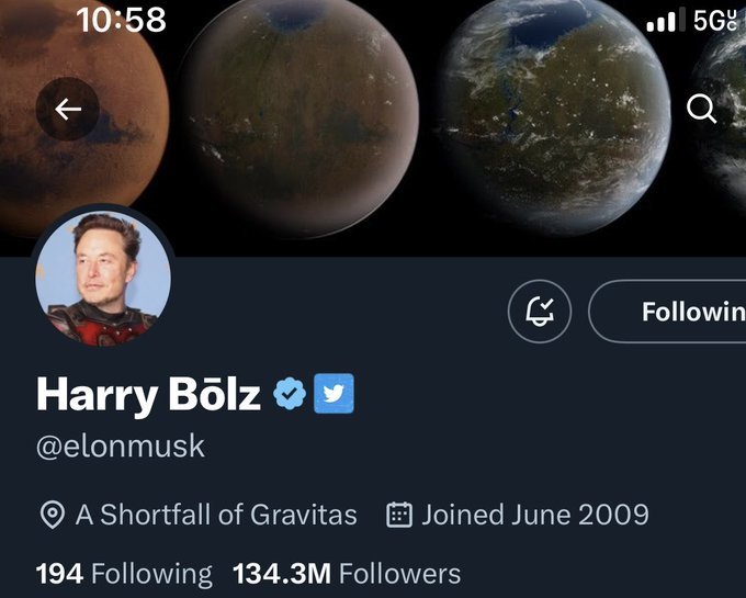 Өмнө нь өөрийнхөө нэрээр "жиргэдэг" байсан Илон Маск хэрэглэгчийн нэрээ өөрчлөн, одоо Harry Bolz нэртэйгээр жиргэдэг болсон байна. Ийнхүү нэрээ солих болсон талаараа тэрбээр ямар нэг тайлбар өгөөгүй аж.
