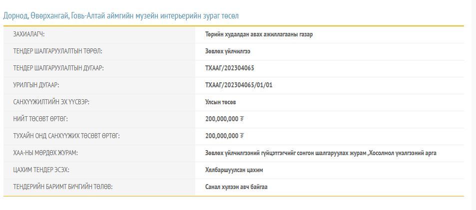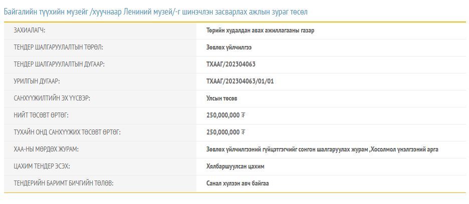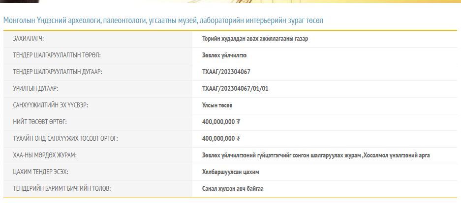 Дээрх гурван тендерийн нийт төсөвт өртөг 850 сая төгрөг болж байна. Сануулахад 2019 онд Байгалийн түүхийн музейг Их тэнгэрийн аманд барьж байгуулахаар төлөвлөж байв. Энэхүү ажилд 100 шахам тэрбум тэрбум төгрөг зарцуулахаар тооцоолсон. Одоогоор энэ ажил хэзээ эхлэх нь тодорхойгүй байна.