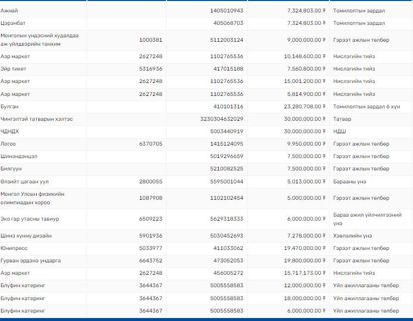 Эрдэнэс Оюу толгой ХХК-ийн хувьд өнгөрсөн гуравдугаар сард 25 төрлийн цалингийн зардлаас бусад таван сая төгрөгөөс дээш үнийн дүн бүхий зарлагын мөнгөн гүйлгээ хийсэн байна. Тухайлбал, 52 сая төгрөгийг томилолтын зардал гэсэн утгатайгаар Н.Цэрэнбат нарын хувь данс руу 54 сая төгрөгийг нислэгийг тийз утгатайгаар нислэгийн компанийн данс руу, 24 сая төгрөгийг гэрээт ажлын төлбөр утгатайгаар хувь хүмүүсийн данс руу, 36 сая төгрөгийг Блүфин катерингийн үйлчилгээний хөлсөнд шилжүүлсэн байна.