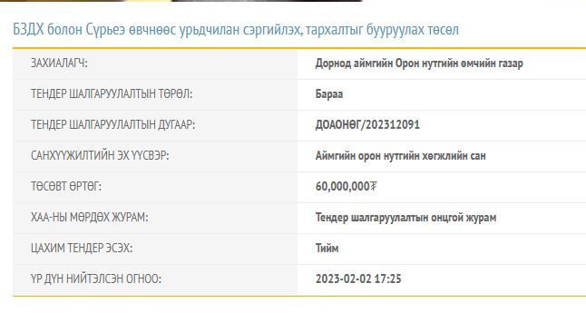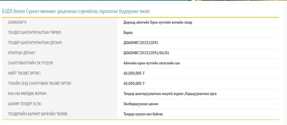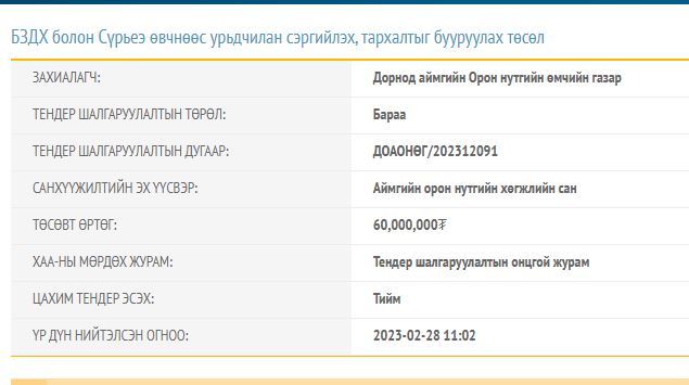 Тендерийн баримт бичигд тусгагдсанаар 60 сая төгрөгийг оношлуур, эмнэлгийн хэрэгсэл авахад зарцуулах юм. Санхүүжилтын эх үүсвэрийг аймгийн орон нутгийн хөгжлийн сангаас гаргахаар тусгажээ. Гэвч энэхүү тендерт оролцохоор саналаа ирүүлсэн иргэн ААН байхгүй учир тендерийг дөрвөн сар дарааллан зарлаж байна.