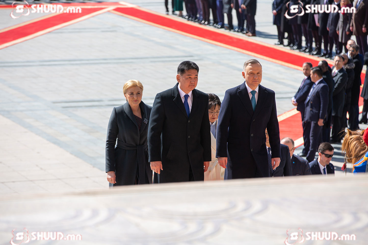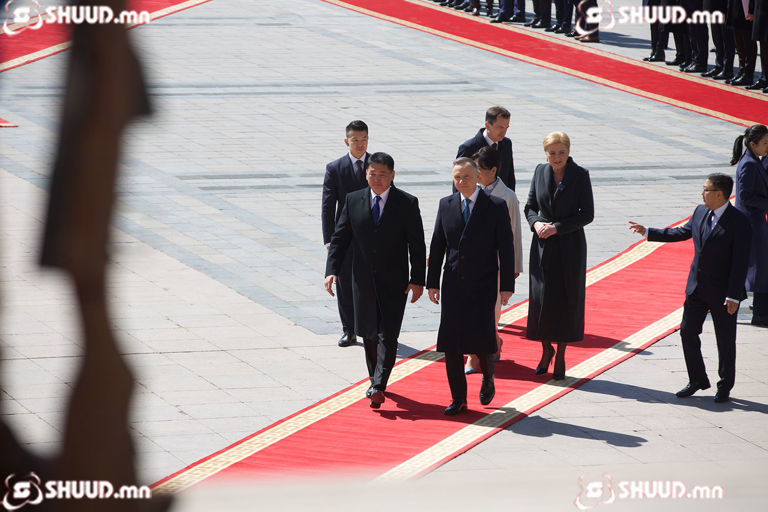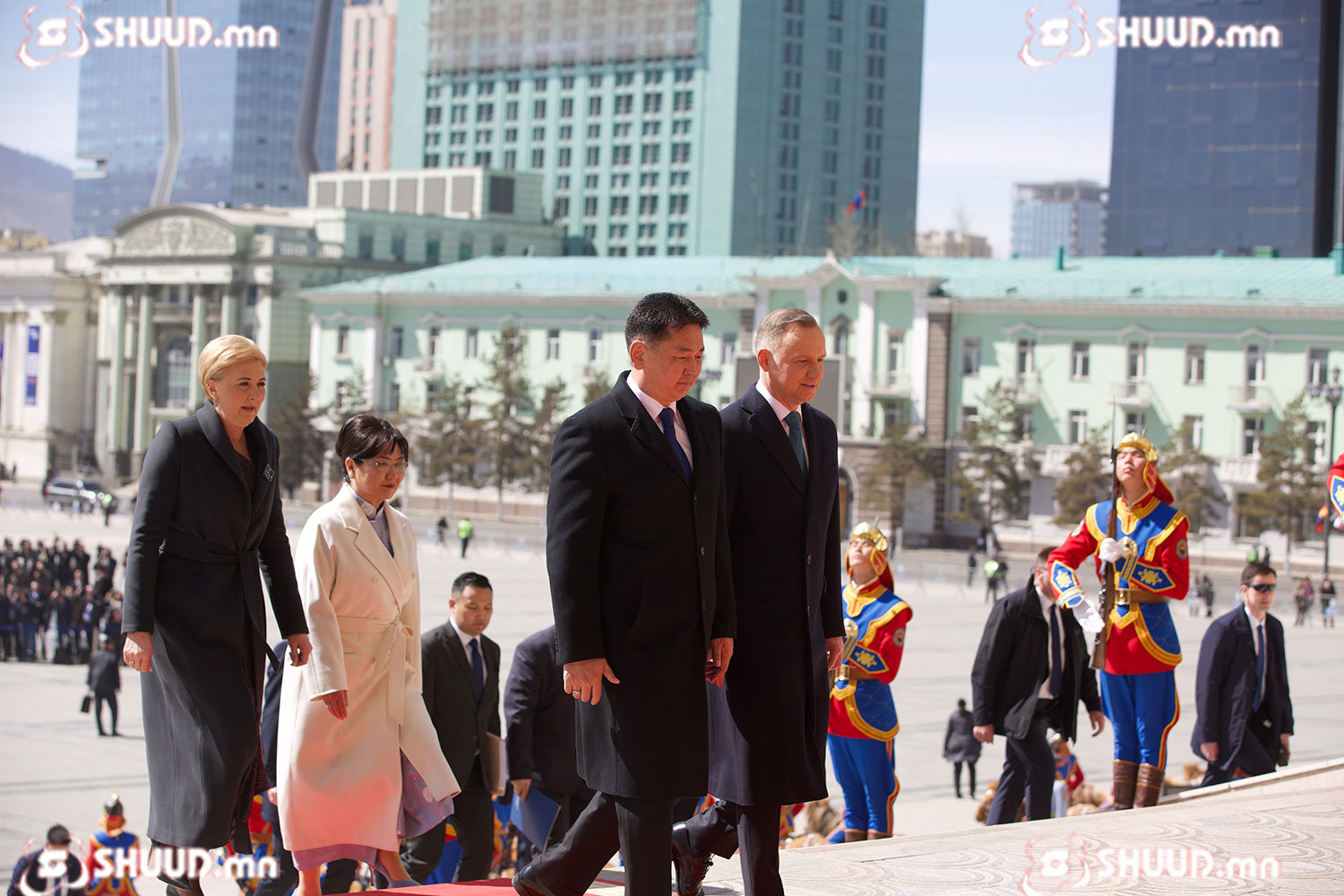 Монгол Улсын Ерөнхийлөгч Ухнаагийн Хүрэлсүх гэргий Л.Болорцэцэгийн хамт БНПУ-ын Ерөнхийлөгч Анджей Дуда, гэргий Агата Корнхаузер-Дуда нарыг жанжин Д.Сүхбаатарын талбайд угтан авлаа.