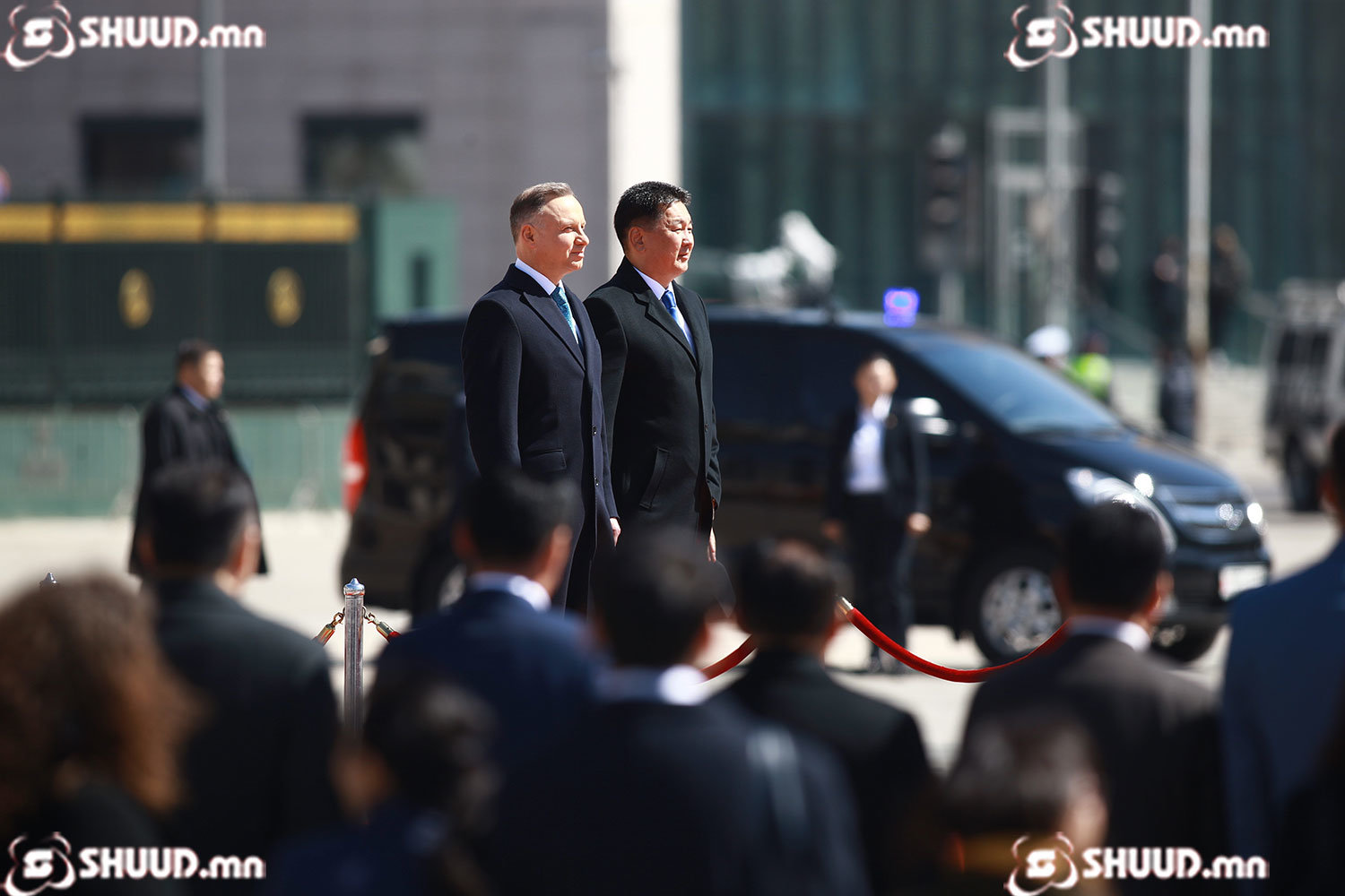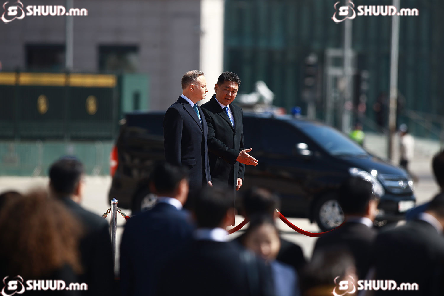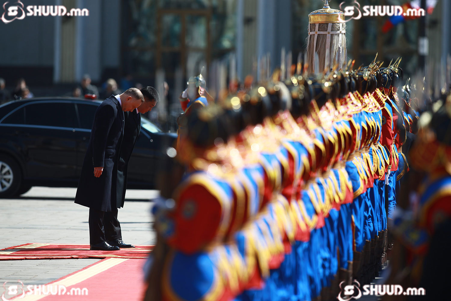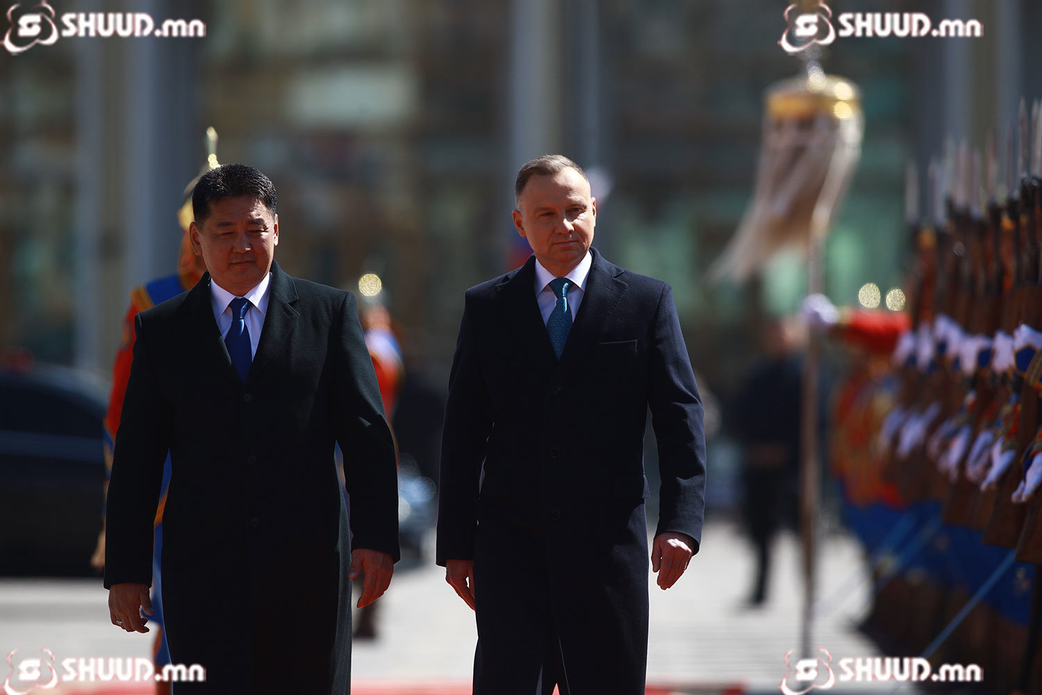 Монгол Улсын Ерөнхийлөгч Ухнаагийн Хүрэлсүх гэргий Л.Болорцэцэгийн хамт БНПУ-ын Ерөнхийлөгч Анджей Дуда, гэргий Агата Корнхаузер-Дуда нарыг жанжин Д.Сүхбаатарын талбайд угтан авлаа.