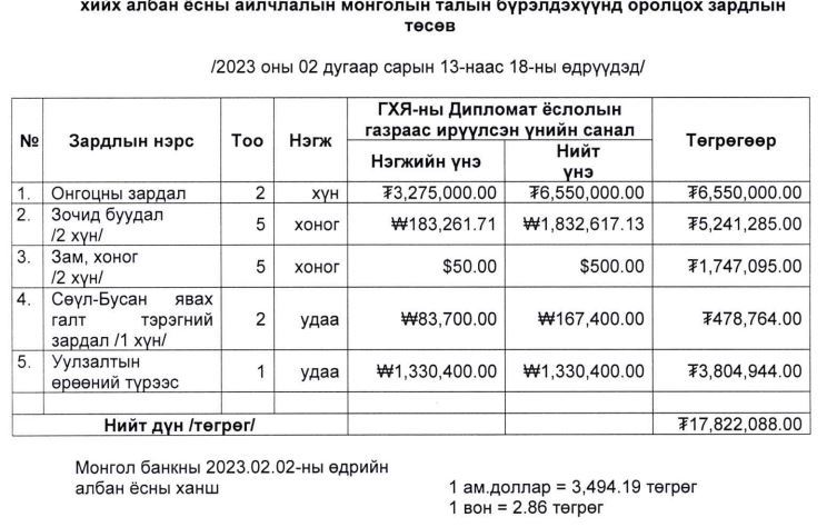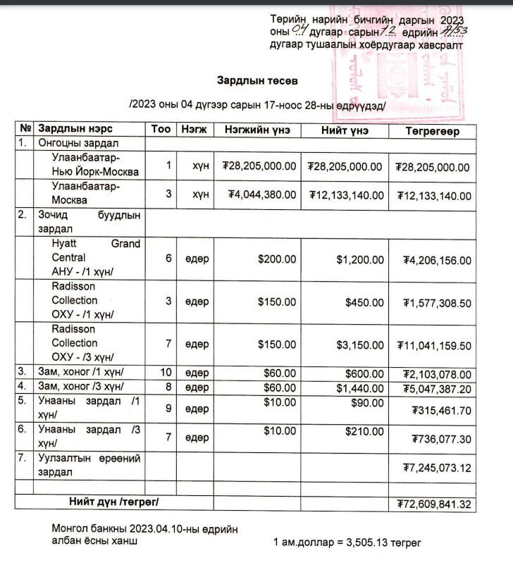 Ч.Хүрэлбаатарын яам 100 гаруй сая төгрөгийг гадаад томилолтод зарцуулжээ