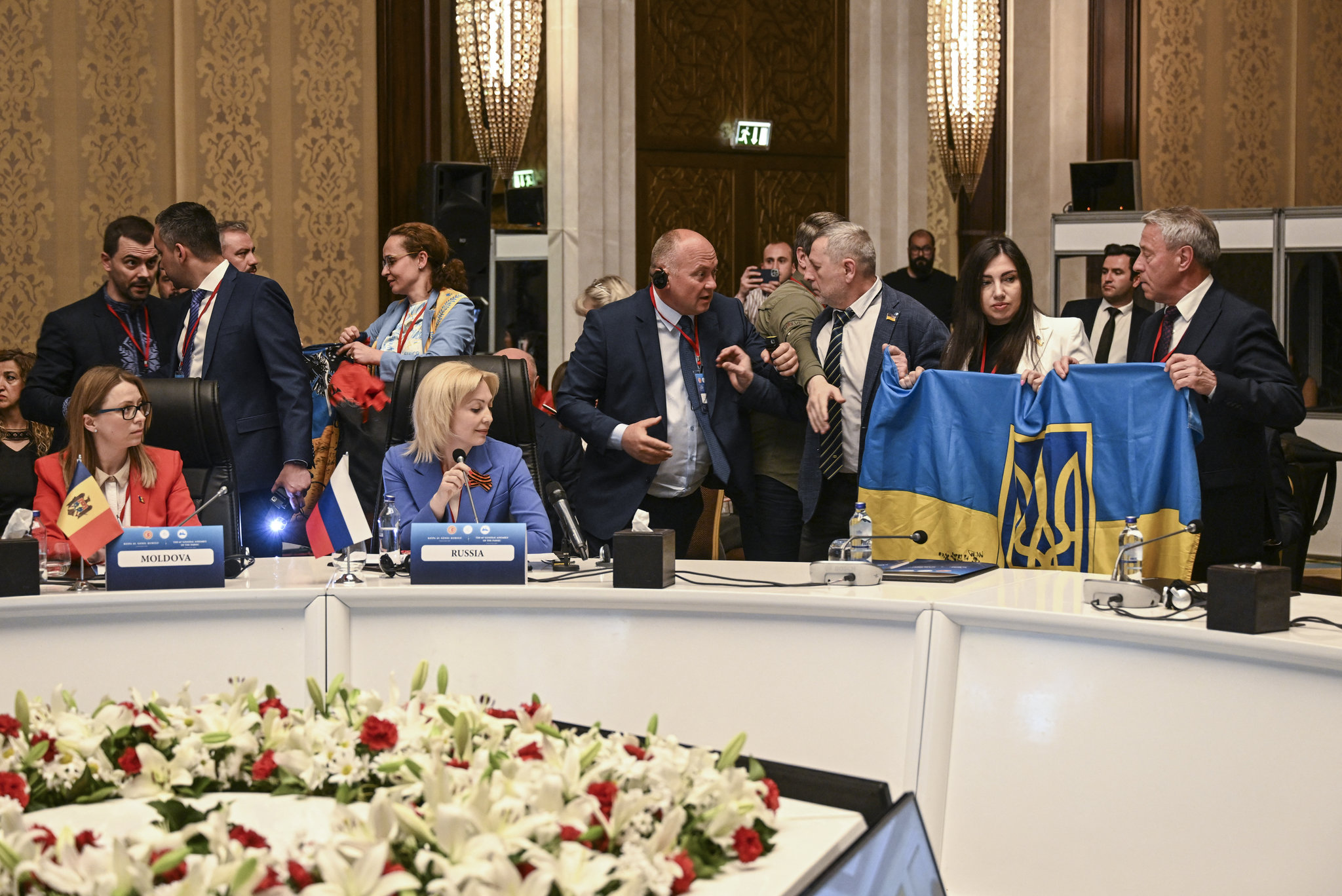 Эх сурвалжийн мэдээлснээр, Оросын Думын депутат, эрх баригч "Нэгдсэн Орос" намын гишүүн Ольга Тимофеева үг хэлэх үеэр сөргөлдөөн гарчээ. Тимофеева энгэртээ Георгийн тууз зүүсэн байсан бөгөөд түүнийг үг хэлэх үеэр Украины парламентын гишүүд ард нь Украины далбаа барих гэхэд Оросын гишүүд үүнд нь саад болсноор сөргөлдөөн эхэлсэн гэнэ. Улмаар тэд хоорондоо зодолджээ.