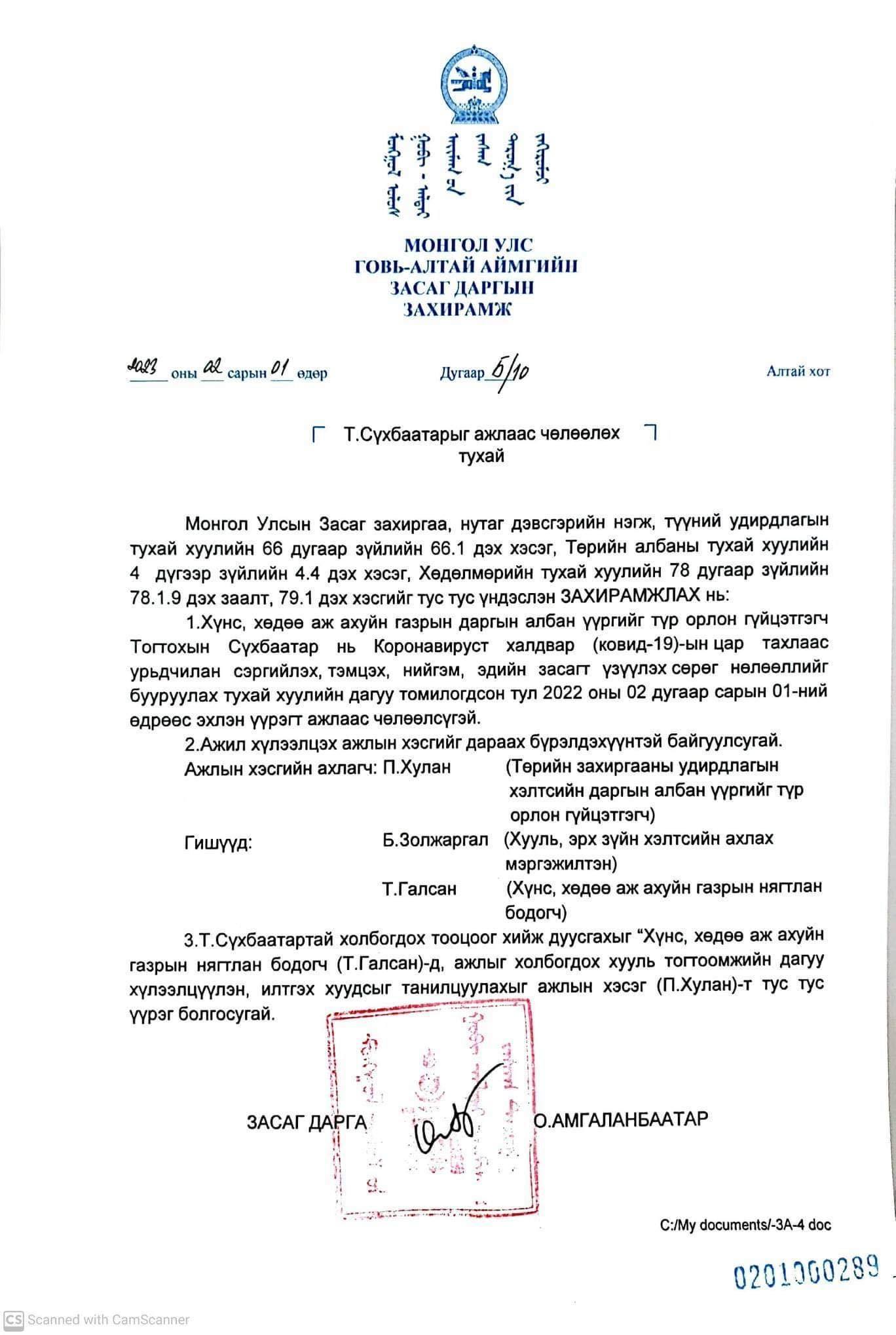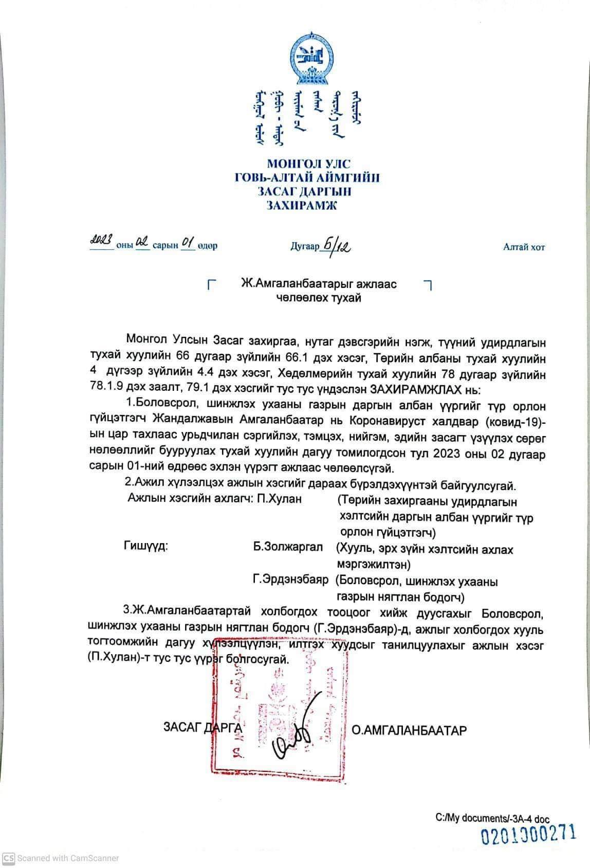 Аймгийн Засаг дарга гэдэг бол тухайн орон нутагтаа төрийн хуулийг ёсчлон биелүүлдэг нэгэн байх ёстой. Гэвч Засаг дарга О.Амгаланбаатар Төрийн албаны тухай, Төрийн хэмнэлтийн тухай, Төсвийн тухай хууль тогтоомж зөрчсөн байна. Түүнийг хууль зөрчсөн гэдгийг Үндэсний аудитын газрын 2022 оны эрсдэлийн аудитын тайлан, Төрийн албаны зөвлөлийн 2021 оны 393, 2022 оны 181, 188 дугаар тогтоолоор тогтоосон. Иймээс аймгийн Иргэдийн хурлын төлөөлөгчид Засаг дарга О.Амгаланбаатарт хариуцлага тооцож, огцруулах саналыг Ерөнхий сайдад хүргүүлж байгаагаа мэдэгдлээ.