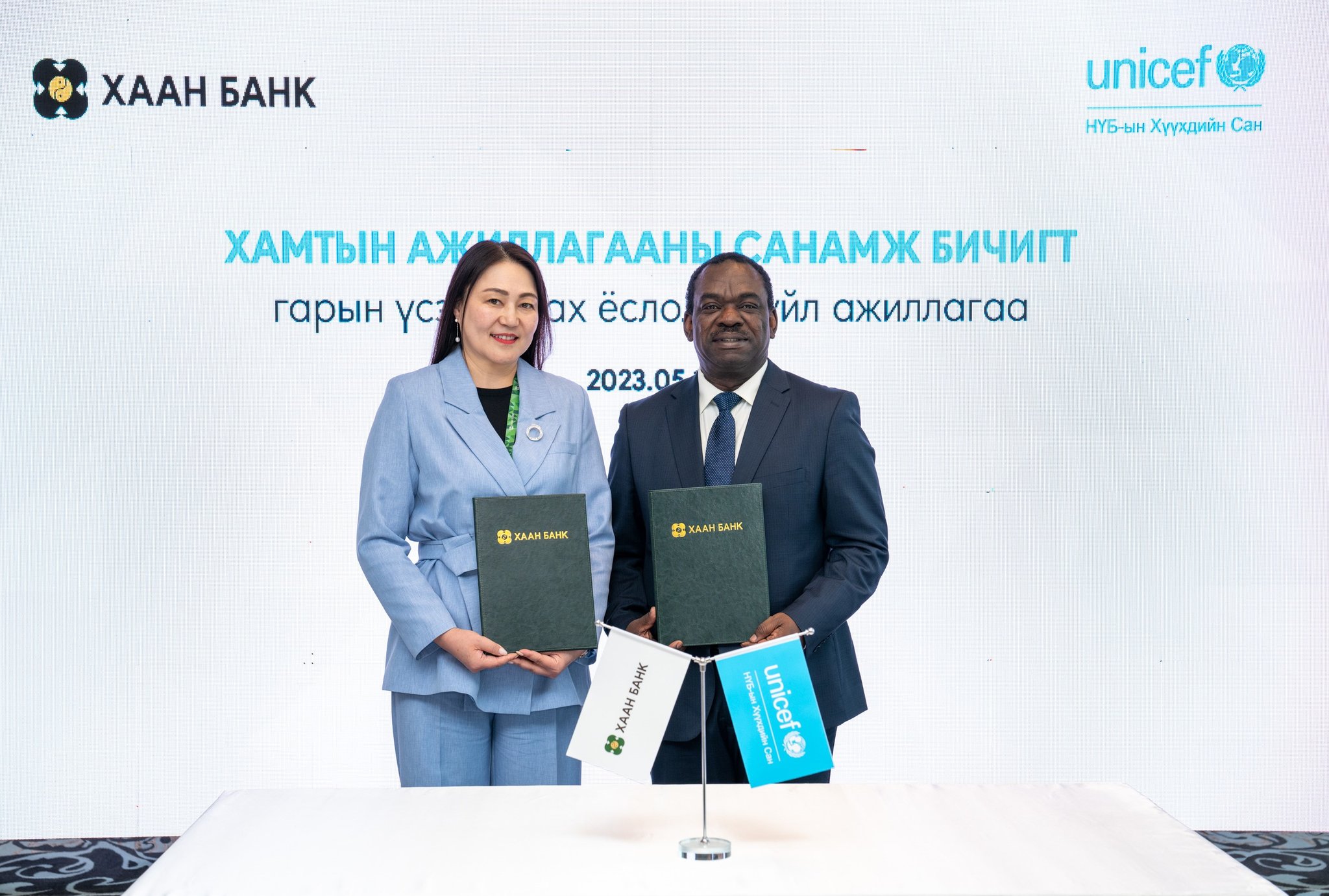 Тогтвортой хөгжил, хүүхдийн эрх хамгаалал, хүртээмжтэй боловсролыг дэмжих чиглэлд ХААН Банк НҮБ-ын Хүүхдийн cантай хамтран ажиллахаар “Харилцан ойлголцлын санамж бичиг”-т 2023 оны 5-р сарын 15-ны өдөр гарын үсэг зурлаа.