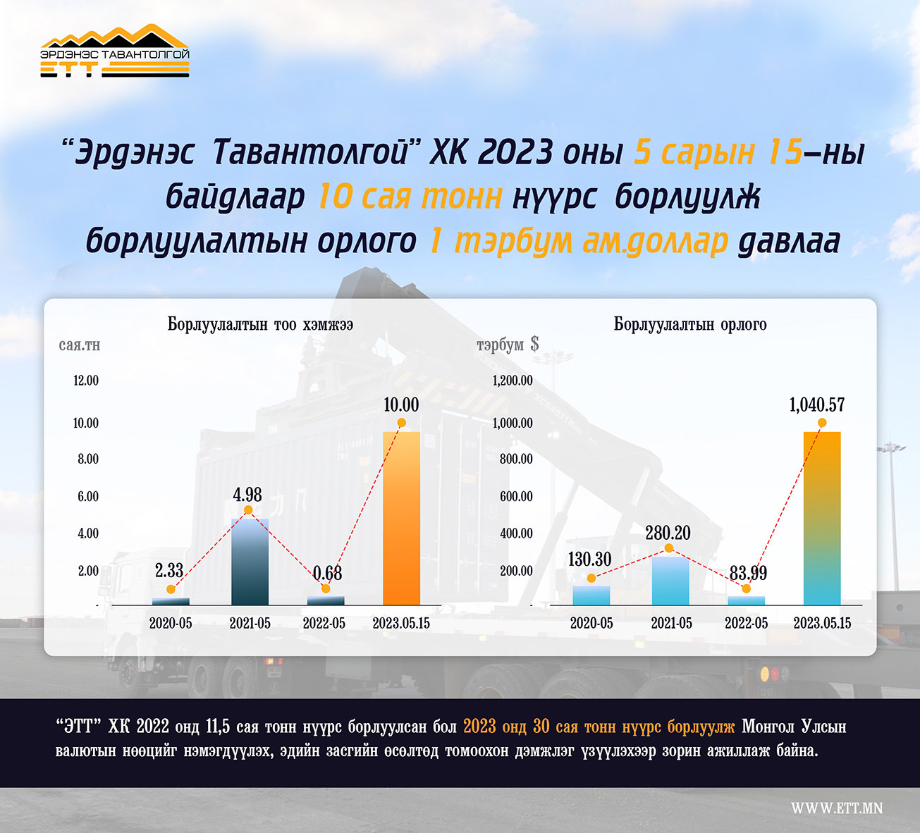 Тус компани 2022 онд 11,5 сая тонн нүүрс борлуулсан бол 2023 онд 30 сая тонн нүүрс борлуулж Монгол Улсын валютын нөөцийг нэмэгдүүлэх, эдийн засгийн өсөлтөд томоохон дэмжлэг үзүүлэхээр зорин ажиллаж байна.