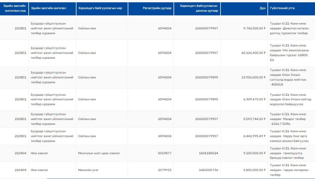 Эдгээр зардал нь Соёлын яамнаас гарсан бөгөөд Соёлын сайдын А/42 тоот тушаал гарган Каннын кино наадамд Монголын кино уран бүтээлчдийг оролцуулахад зориулан Кино урлагийн зөвлөлийн ажлын алба руу 501 сая төгрөг шилжүүлсэн байна. Гэвч энэхүү үйл ажиллагаад яг кино уран бүтээлчид оролцож чадсан уу гэх асуулт анхаарал татаж байна.