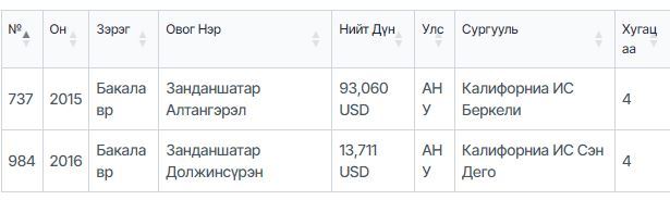 Энэ бол 2013-2015 он. Тэгвэл тухайн үед буюу 2015 онд Г.Занданшатарын хүү Алтангэрэл нь АНУ-ын Калифорниа их сургуульд суралцахаар Боловсролын зээлийн сангаас 93 мянган долларын зээл авчээ. Үүний дараа буюу 2016 онд дахин УИХ-ын гишүүнээр сонгогдоход охин Должинсүрэн нь 2013 долларын зээлийг авч суралцсан байна.