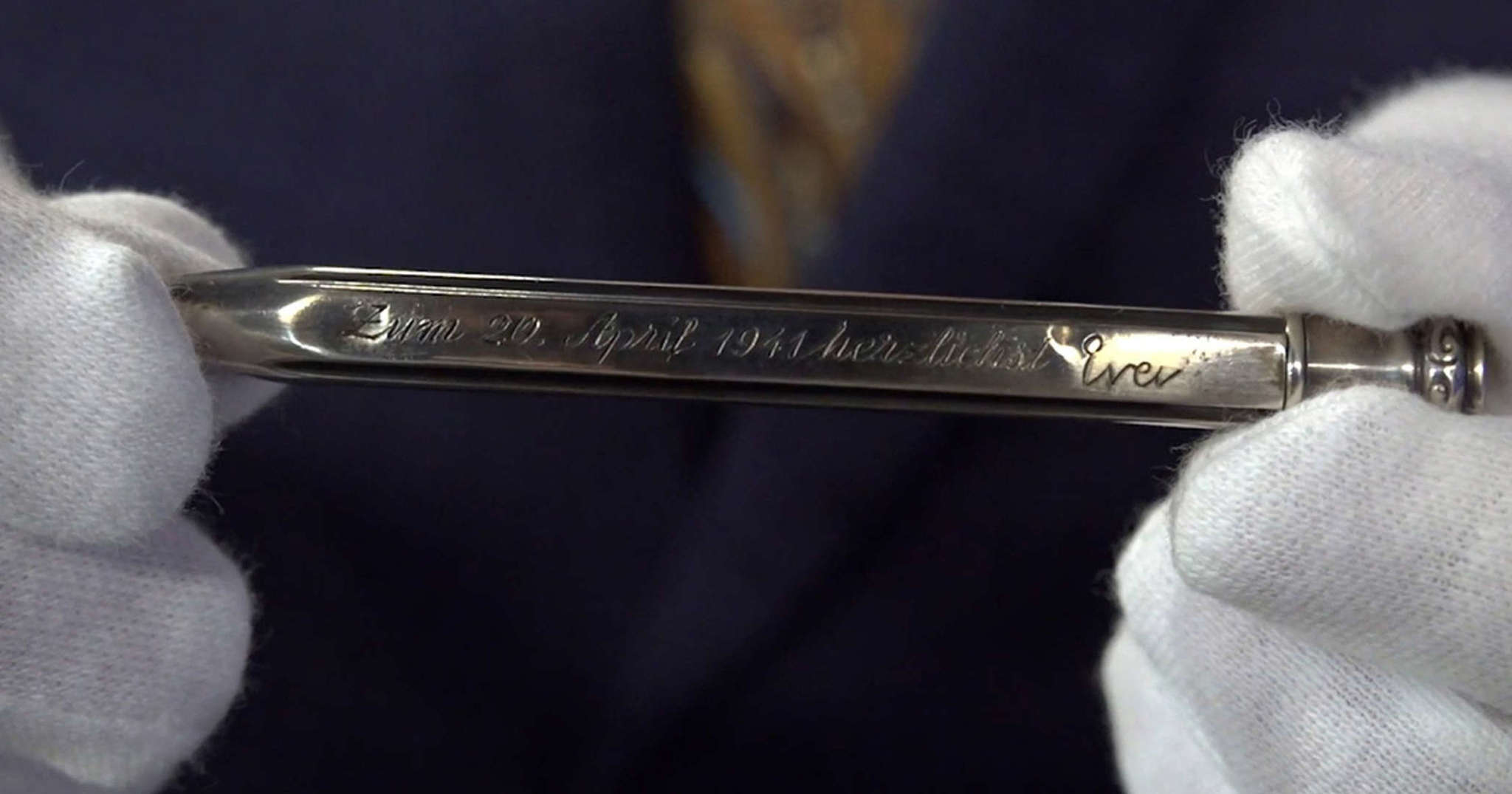 Ева Гитлерийн 52 насны төрсөн өдөрт зориулан энэ харандааг бэлэглэсэн аж. Харандааг 50 000-80 000 фунт стерлингээр үнэлж байгаа гэнэ. Мөн ар талд нь Гитлерийн гарын үсэг бүхий гэрэл зургийг дуудлага худалдаанд оруулахаар болсон талаар эх сурвалж мэдээлжээ.