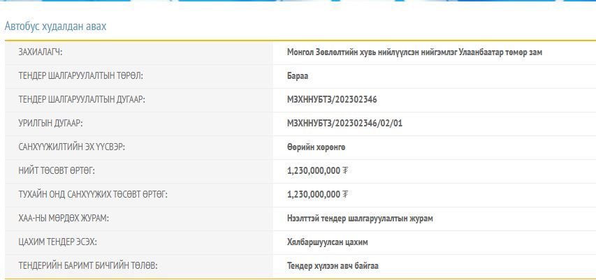 Улаанбаатар төмөр зам нийгэмлэг нь энэ төсвийн жилд 220 төрлийн худалдан авалт хийхээр төлөвлөсөн байна. Үүнээс ачааны автомашин, автобус, суудлын автомашин худалдан авахад ГУРВАН тэрбум төгрөгийг зарцуулах юм. Тэгвэл өнгөрсөн баасан гарагт нийт 1,2 тэрбумаар дээрх төрлийн худалдан хийхээр тендер зарлажээ.