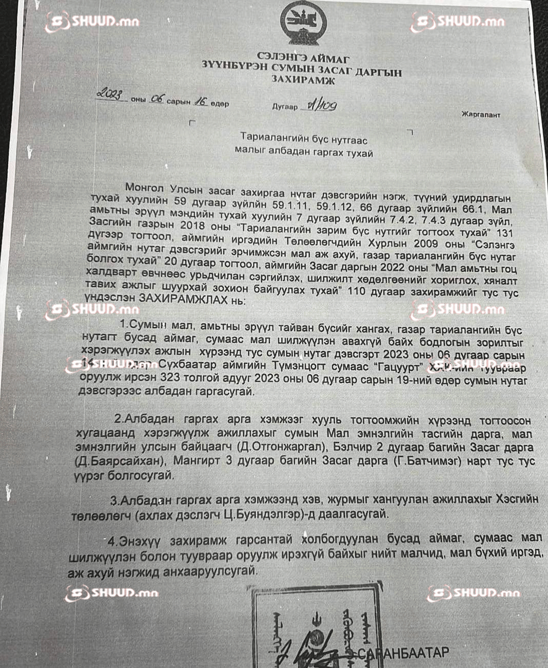 Цагдаагийн байгууллагаас дээрх ёс бус, хууль бус ямар арга хэмжээ авч байгаа эсэх нь тодорхойгүй тав хонож байна. Тэгвэл Сэлэнгэ аймгийн Зүүнбүрэн сумын Засаг даргын даргын захирамжаар Л.Чинбатыг адууг албадан гаргахаар болжээ. Тодруулбал, энэ сарын 14-ний өдөр Сүхбаатар аймгийн Түмэнцогт сумаас Гацуурт компанийн туувраар оруулж ирсэн 323 толгой адууг өнөөдөр тус сумын нутаг дэвсгэрээс албадан гаргахаар захирамж гараад байгаа аж. Тус захирамжийг өнгөрсөн баасан гарагт гаргажээ.