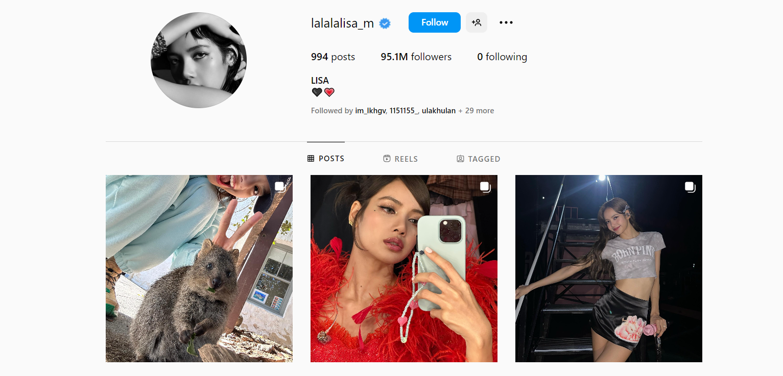 БНСУ-ын төдийгүй дэлхийн алдартай хамтлаг Blackpink хамтлагийн гишүүн Лиса инстаграмдаа хамгийн олон дагагчтай / 95.1 сая / к-поп од боллоо.