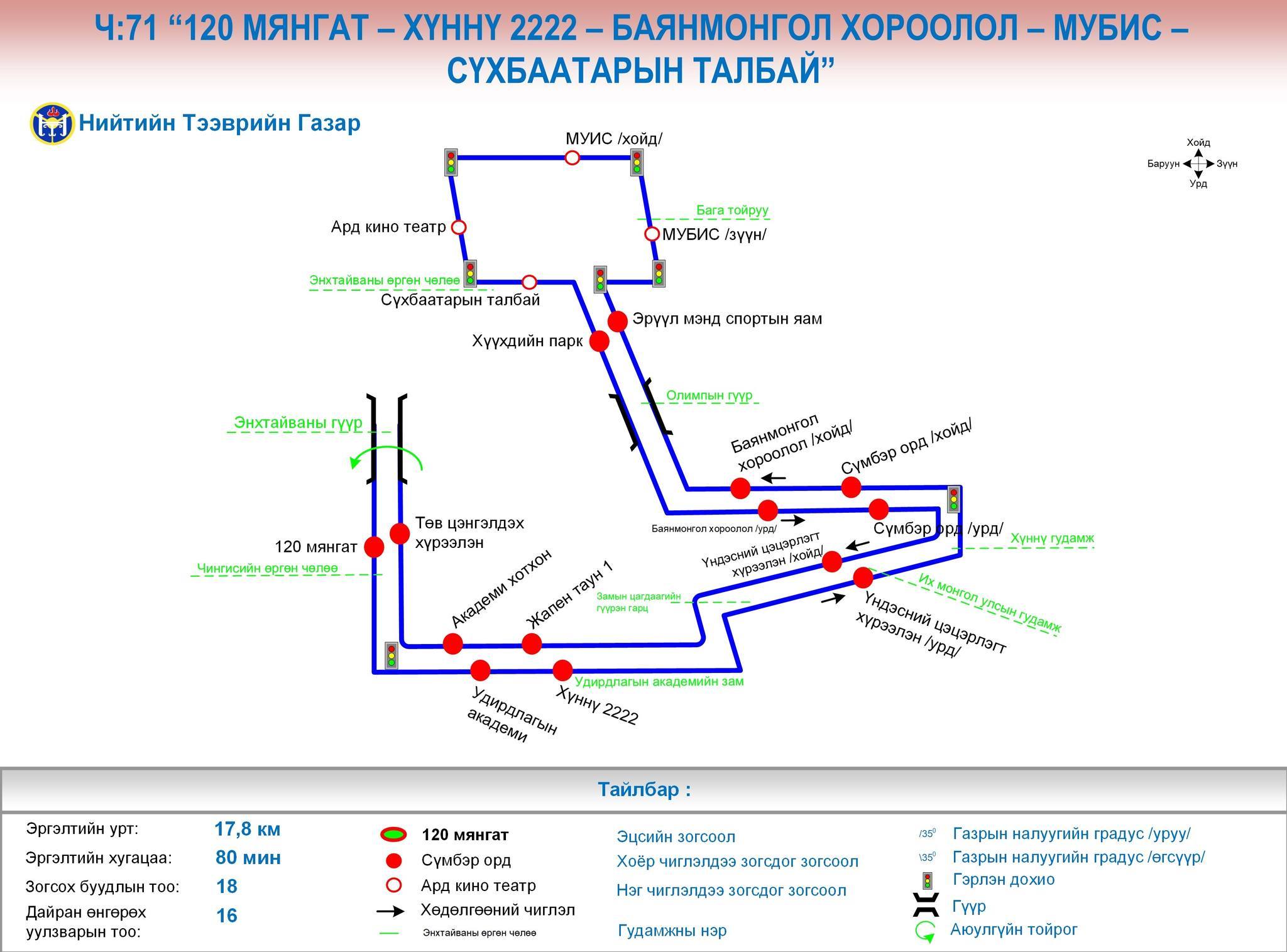 4. Ч:71 “Дүнжингарав худалдааны төв-Баянмонгол хороолол-Хүннү 2222-Төв цэнгэлдэх хүрээлэн” чиглэлийн замналд өөрчлөлт оруулж, Ч:71 “120 мянгат-Хүннү 2222-Баянмонгол хороолол-МУБИС-Сүхбаатарын талбай” болгон өөрчилж, өдөрт 7 тээврийн хэрэгсэл 11 минутын интервалтай ажиллана.