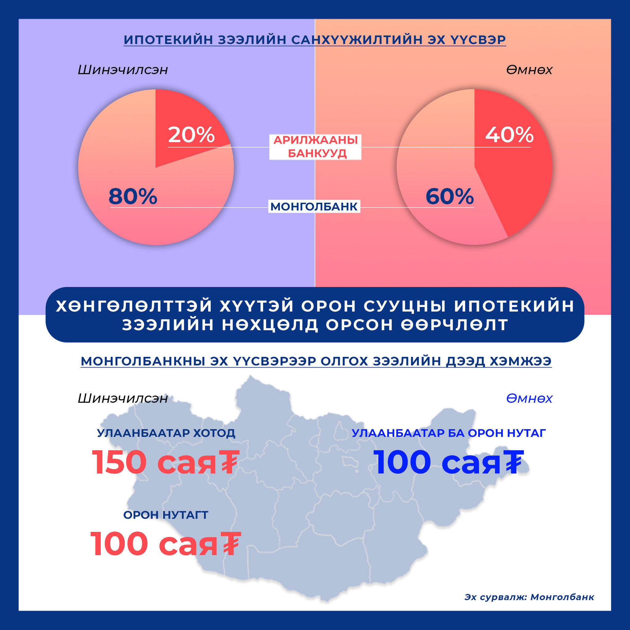 Ипотекийн хөтөлбөрийн нийт санхүүжилтийн 80 хувийг Монголбанк, 20 хувийг банкууд өөрийн эх үүсвэрээр 2022 оны 10 дугаар сараас эхлэн санхүүжүүлэх,