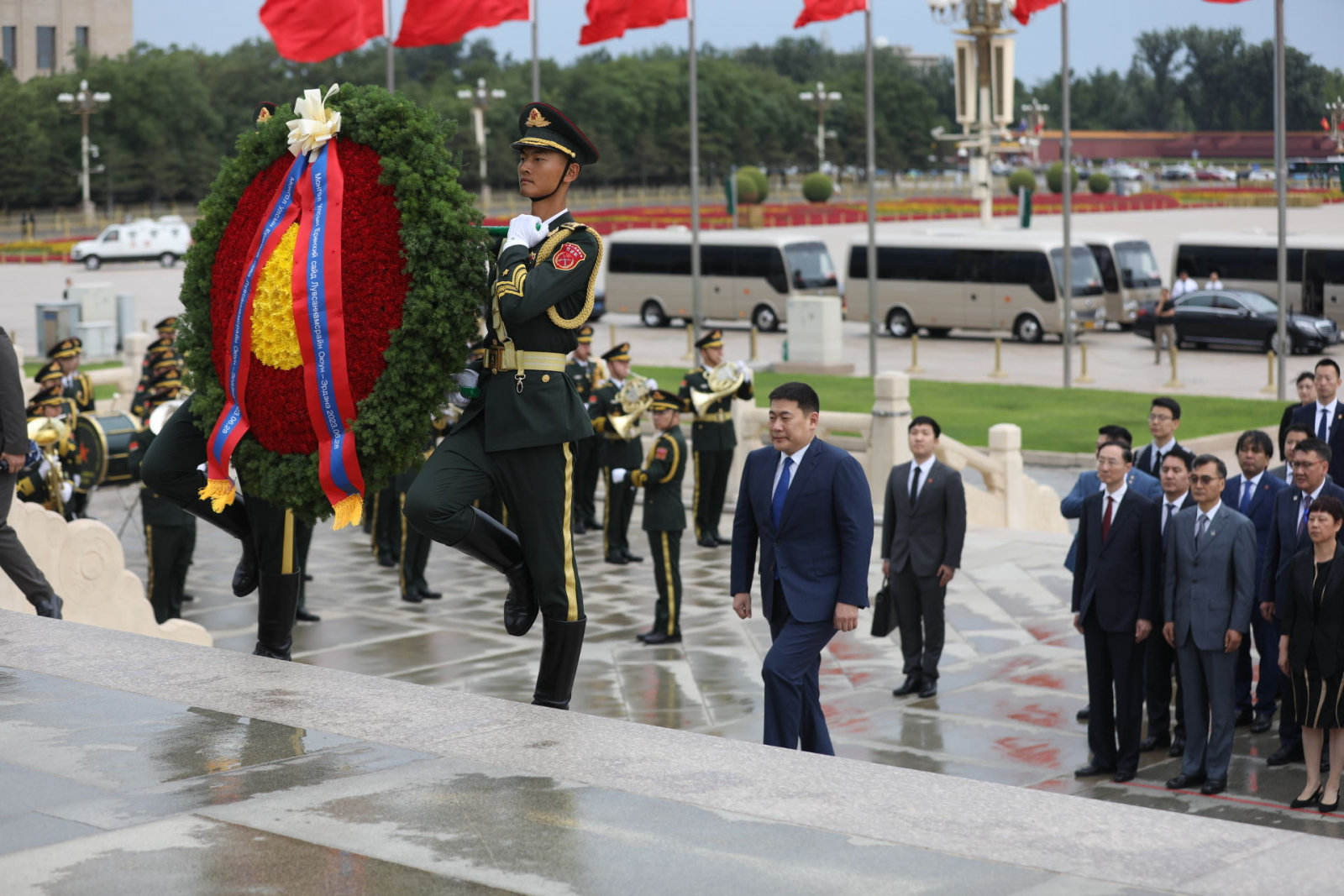 БНХАУ-д албан ёсны айлчлал хийж буй Монгол Улсын Ерөнхий сайд Л.Оюун-Эрдэнэ 2023 оны зургадугаар сарын 28-ны өдөр Бээжин хотноо Хятадын Ардын баатруудын хөшөөнд цэцэг өргөв.