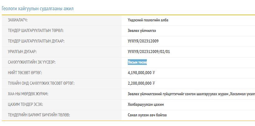 Өнгөрсөн дөрөвдүгээр сард Үндэсний геологийн албанаас 2.2 тэрбумын төсөвт өртөгтэй тендер зарласан. Энэхүү тендерт 10 гаруй компани оролцсон ч холбогдох шаардлагуудыг хангаагүй учраас учраас дахин тедер зарласан байна.