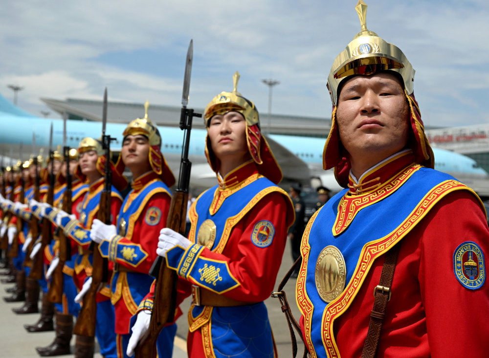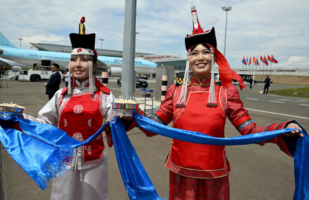 Тэднийг улаан хивс дэвсэн, үндэсний хувцас өмссөн эмэгтэйчүүд хадаг, мөнгөн аяга барин угтжээ.