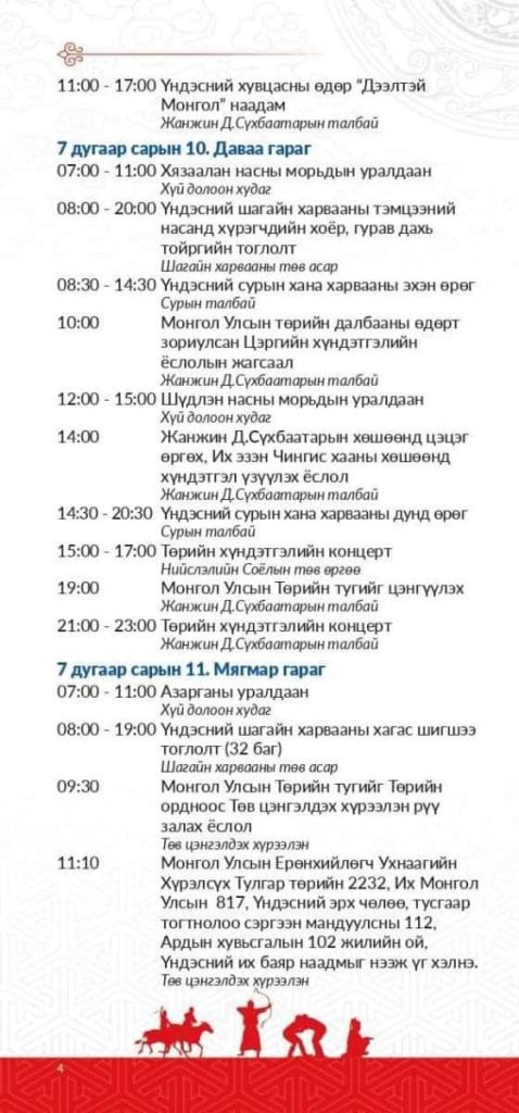 Тулгар төрийн 2232, Их Монгол Улсын 817, Үндэсний эрх чөлөө тусгаар тогтнолоо сэргээн мандуулсны 112, Ардын хувьсгалын 102 жилийн ойн баяр тохиож буй. Энэ өдөр Азарга болон Их насны хурдан морьд уралдахаас гадна хүчит нөхийн барилдааны нэг, хоёрын даваа болох юм. Мөн өглөөний 11 цаг 20 минутаас Үндэсний их баяр наадмын нээлтийн арга хэмжээ эхэлнэ.