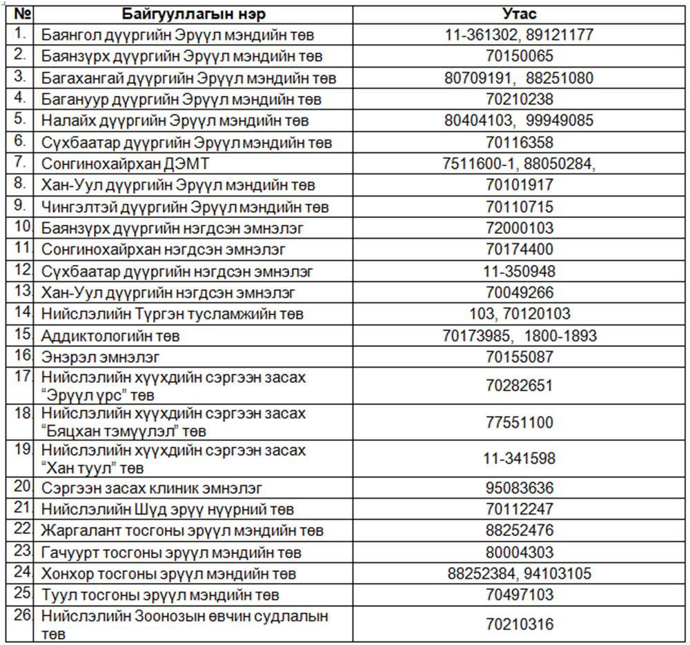 Нийслэлийн харьяа эрүүл мэндийн байгууллагуудын хариуцлагатай жижүүрийн утас: