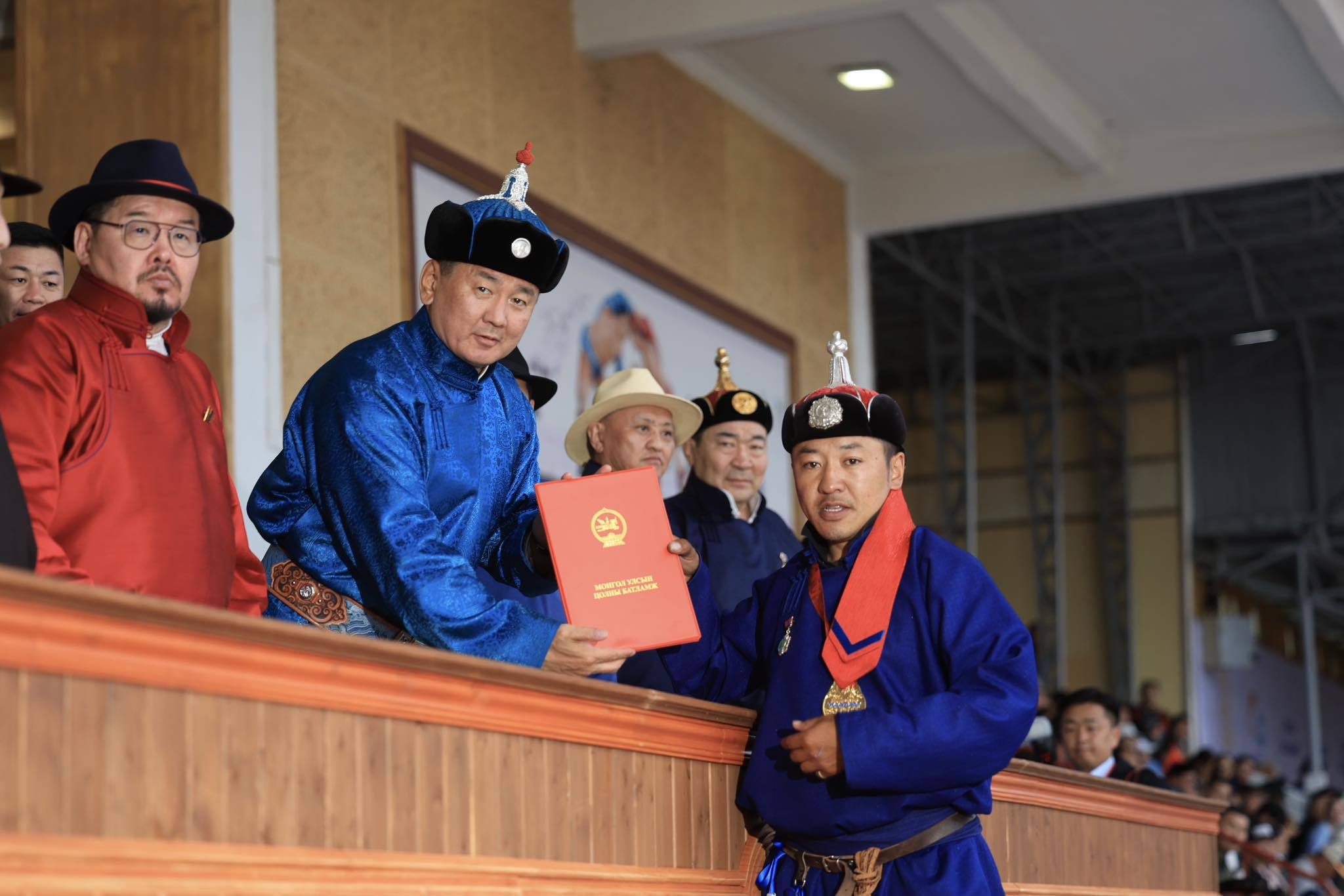 “Улсын цол олгох тухай” зарлигийг Монгол Улсын Ерөнхийлөгчийн Тамгын газрын дарга Я.Содбаатар уншиж танилцуулсны дараа Монгол Улсын Ерөнхийлөгч Ухнаагийн Хүрэлсүх харваачдад Монгол Улсын цолны батламж, тэмдгийг нь гардуулан өгч, баяр хүргэлээ.