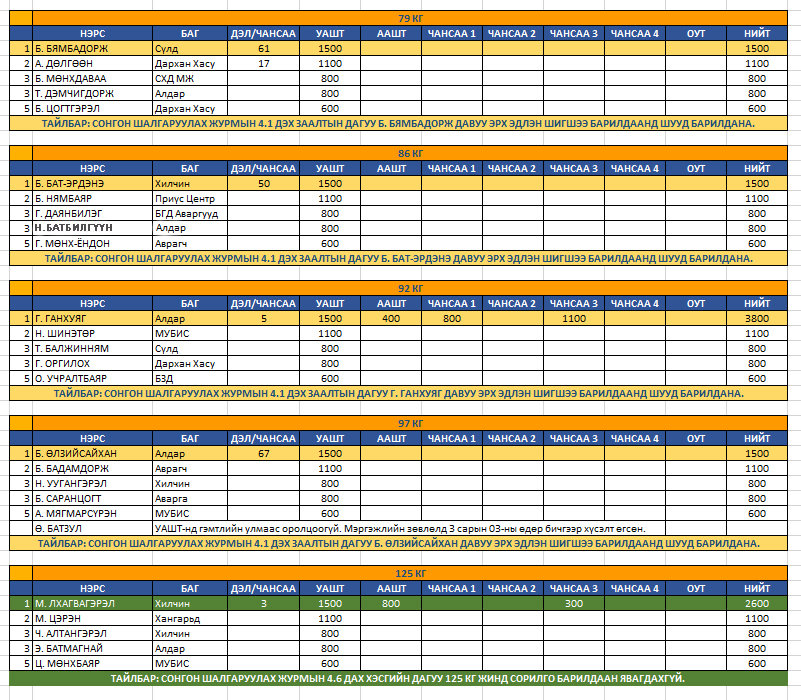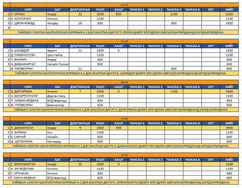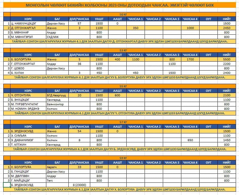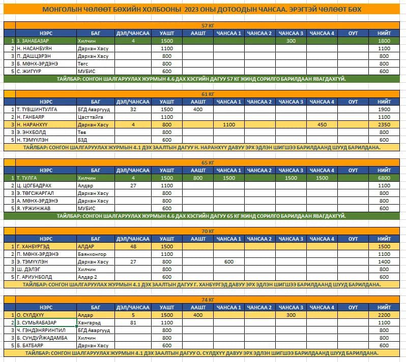 Монголын чөлөөт бөхийн холбоо тамирчдын дотоодын чансааг нэгтгэн, сорилго барилдаанд оролцох жин тус бүрийн эрэгтэй тав, эмэгтэй дөрвөн тамирчдын нэрсийг зарлаад байна.