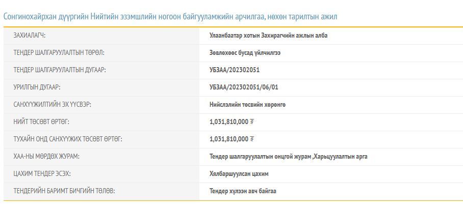 Тендерийн төсөвт өртөг НЭГ тэрбум төгрөг байх юм. Нийт таван байршилд ногоон байгууламжийн арчилгаа, нөхөн тарилт хийх юм. Тодруулбал, Үйлдвэрчний эвлэлийн гудамж, Геологийн төв лабораториос ханын материал хүртэл замын 2 талын ногоон байгууламж, Барилгачдын гудамжны ногоон байгууламж, Залуусын гудамж, 5 шарын уулзвараас BSB дэлгүүр хүртэл гурван байршилд ногоон байгууламж хийх бол Өнөр хорооллын гудамж 1-р хороолол арын зам дагуу зүлэгжүүлсэн талбайн арчилгааны ажил, Сонсголонгийн гүүрний голын зурвас, Найрамдлын гудамжны ногоон байгууламжийн арчилгааны ажлыг хийхээр тендер зарласан байна.