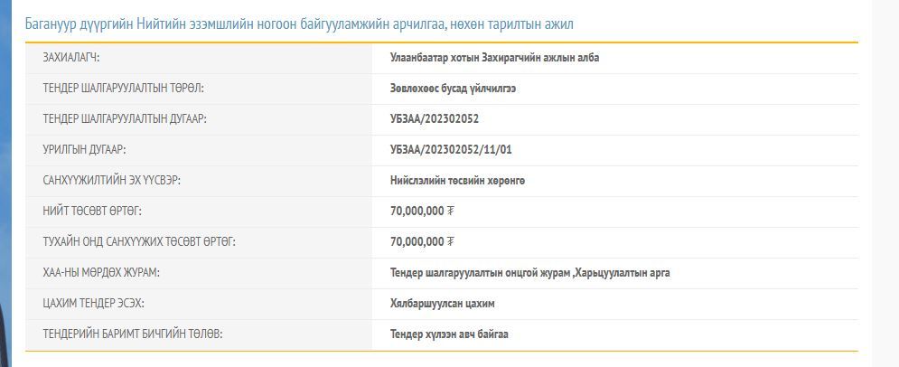 Харин нийслэлийн Багануур дүүрэгт нийтийн эзэмшлийн ногоон байгууламжийн арчилгаа, нөхөн тарилтын ажил хийхээр 70 сая төгрөгийн тендер зарлажээ.