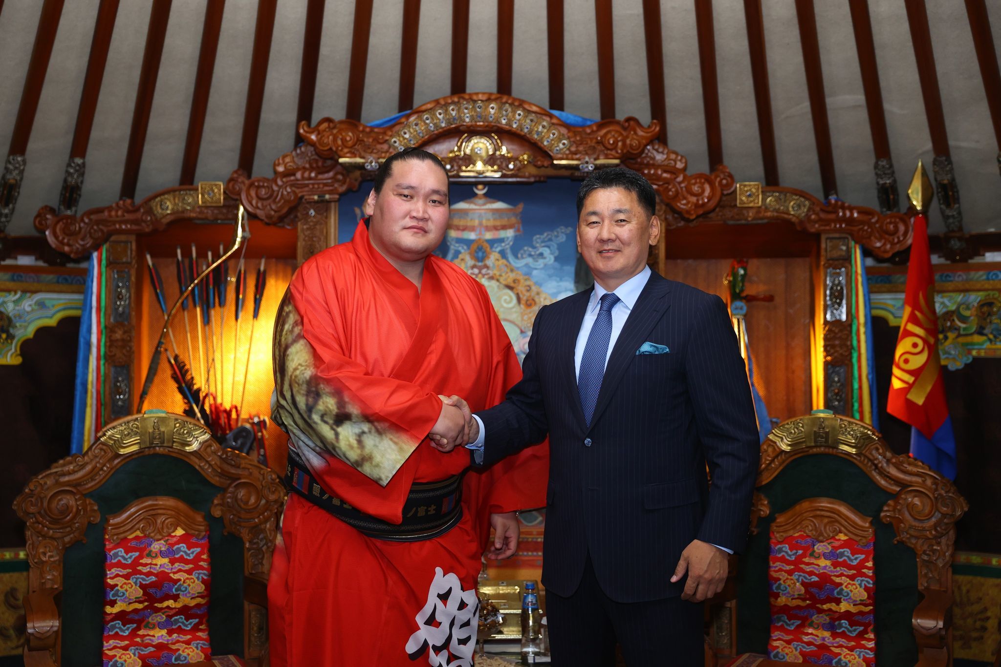 Монгол Улсын Ерөнхийлөгч Ухнаагийн Хүрэлсүх мэргэжлийн сүмогийн 73 дахь их аварга Тэрүнофүжи Г.Ган-Эрдэнийг хүлээн авч уулзлаа.