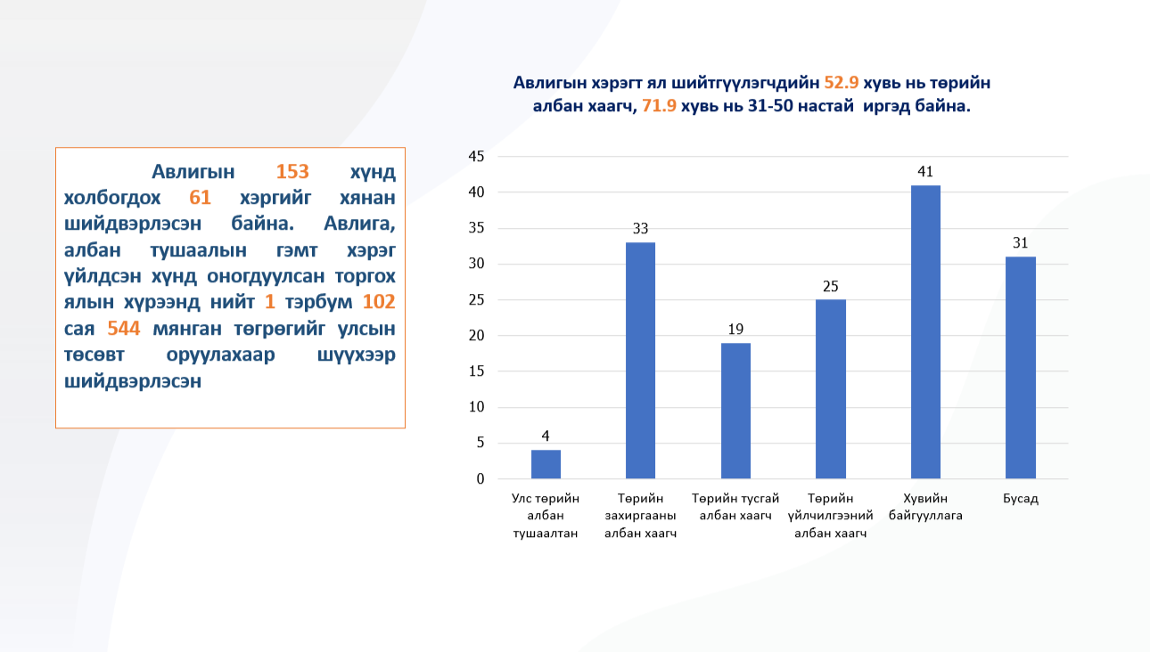 Шүүх байгууллага авлигын 153 хүнд холбогдох 61 хэргийг хянан шийдвэрлэсэн байна. Авлига, албан тушаалын гэмт хэрэг үйлдсэн хүнд оногдуулсан торгох ялын хүрээнд нийт 1 тэрбум 102 сая 544 мянган төгрөгийг улсын төсөвт оруулахаар шүүхээр шийдвэрлэсэн байна.
