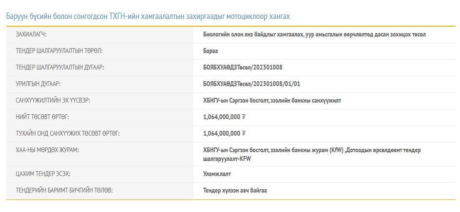 Тендерийн төсөвт өртөг НЭГ тэрбум 64 сая төгрөг байна. Зарлагдсан тендерийн баримт бичигт хичнээн тооны мотоциклийг энэ хэмжээний хөрөнгөөр авах тооцооллыг хавсаргаагүй байна. Ямартай ч ХБНГУ-ын Сэргээн босголтын зээлийн банкны буцалтгүй тусламжийн ТЭРБУМ төгрөг мотоцикл худалдан авах үйл ажиллагаанд зарцуулагдах нь ээ.