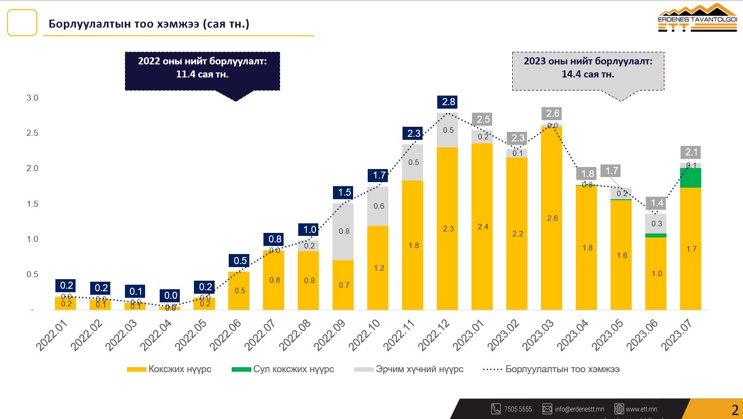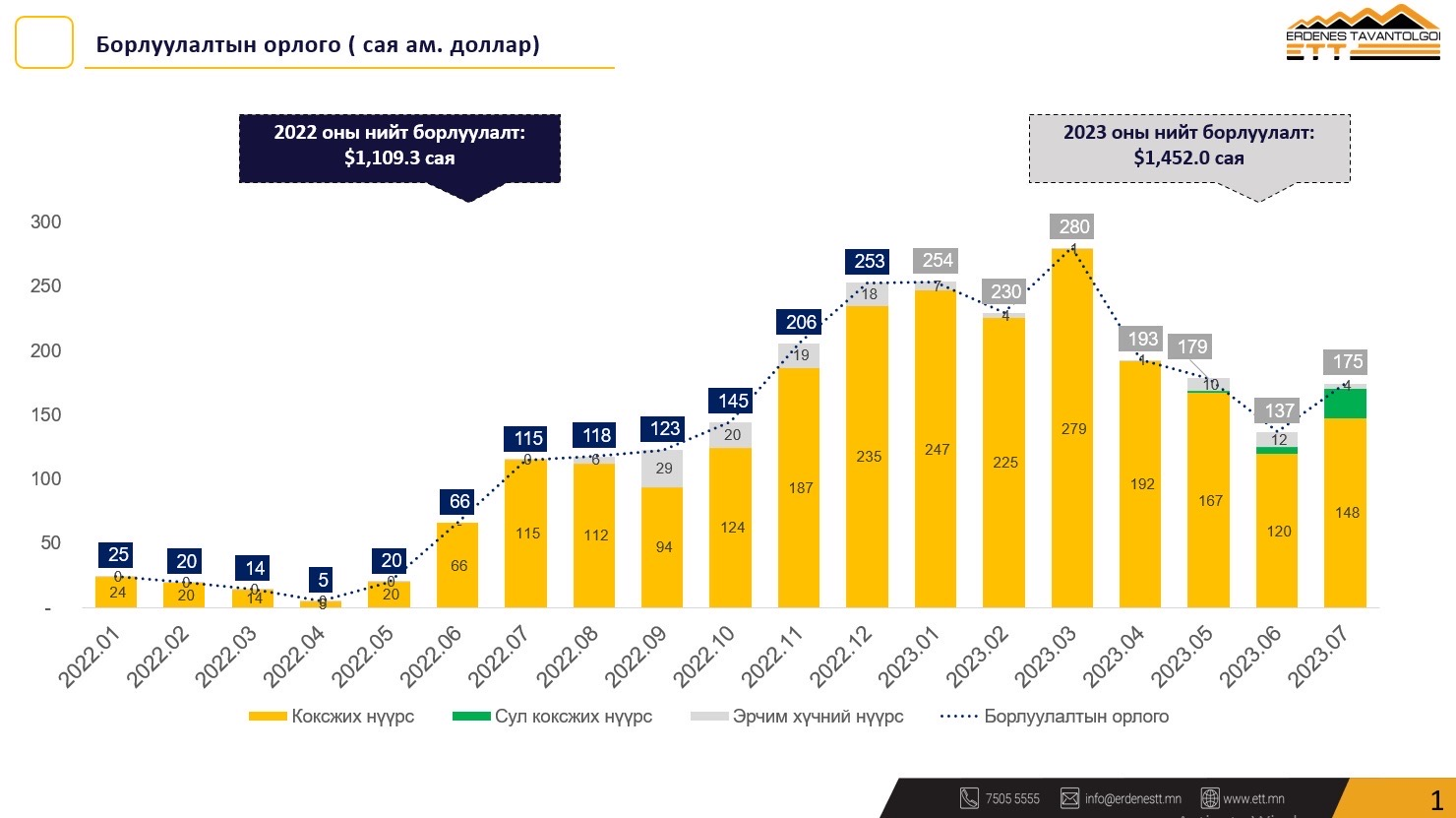 "Эрдэнэс Тавантолгой” ХК-д 2022 оны 10 дугаар сард онцгой дэглэм тогтоосноос хойш компаний борлуулалт 4,1 дахин, нүүрс тээвэр 3,9 дахин экспорт 2 дахин, олборлолт 2,7 дахин нэмэгджээ. Өнгөрсөн 2022 онд 11.5 сая тонн нүүрс экспортолж, 1,1 тэрбум ам.долларын борлуулалттай ажилласан. Тэгвэл 2023 оны 07 сарын 31-ний өдрийн байдлаар 14.4 сая тонн нүүрс экспортолж, 1,4 тэрбум ам.долларын борлуулалт хийн, 2022 оны бүтэн жилийн борлуулалтыг 125 хувиар, орлогыг 131 хувиар давуулан биелүүллээ.