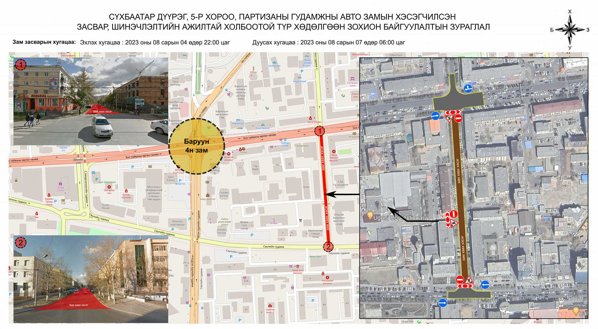 Сүхбаатар дүүрэг 5-р хороо Партизаны гудамжны авто замын хэсэгчилсэн засвар, шинэчлэлтийн ажил энэ сарын 04-ний өдрийн 22:00 цагаас 07-ний өдрийн 06:00 цагийн хооронд хааж хэсэгчилсэн засвар, шинэчлэлтийн ажлыг хийж гүйцэтгэнэ.
