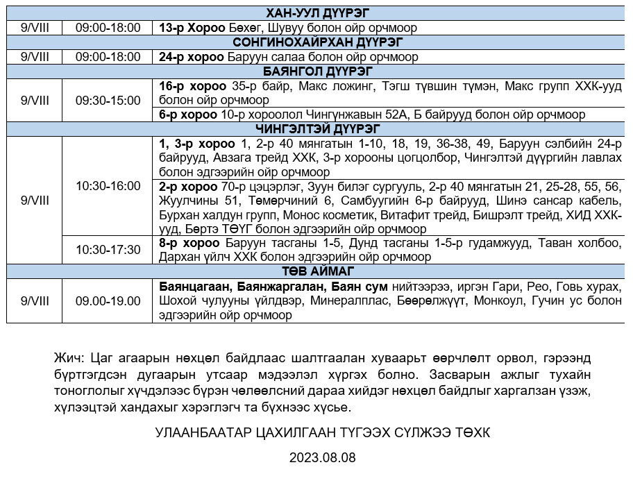 Өнөөдөр буюу 08 дугаар сарын 09-ний лхагва гаригт цахилгаан хязгаарлах байршлуудыг танилцуулж байна.
