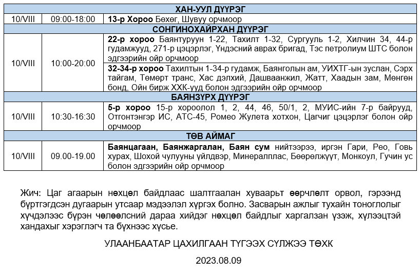 Өнөөдөр буюу 08 дугаар сарын 10-ны пүрэв гаригт дараах байршлуудад цахилгаан хязгаарлана.