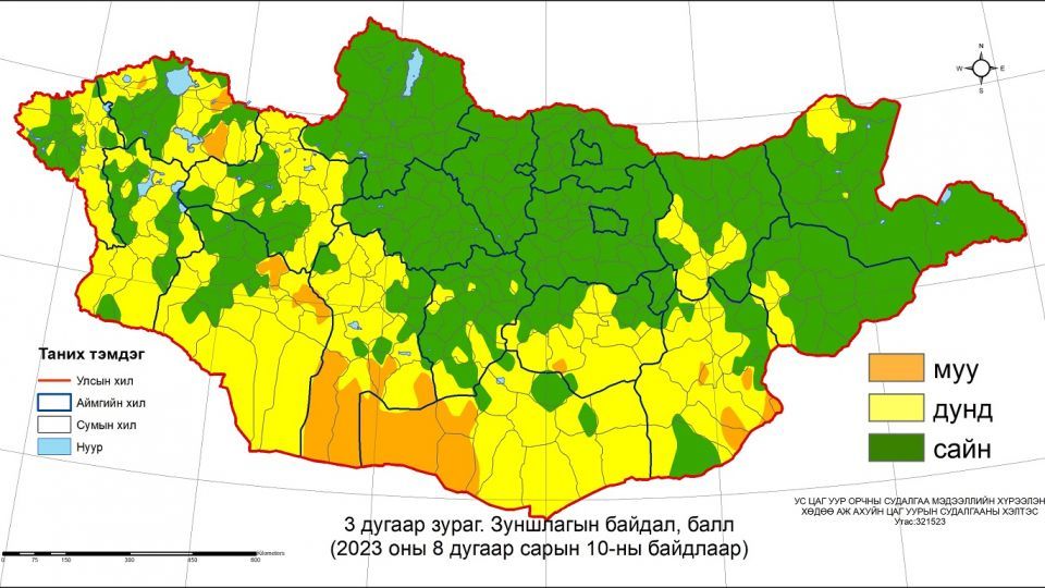Тодруулбал, Архангай, Хөвсгөл, Булган, Орхон, Сэлэнгэ, Дархан-Уул, Улаанбаатар, Төв, Говьсүмбэрийн нийт, Өвөрхангай, Хэнтий, Сүхбаатар, Дорнодын ихэнх, Баян-Өлгий, Увс, Ховд, Завхан, Говь-Алтай, Баянхонгор, Дундговь, Дорноговийн зарим, Өмнөговийн ганц нэг сумдын нутгаар хэвийн, Баянхонгор, Өмнөговийн зарим, Увс, Говь-Алтай, Дорноговийн ганц нэг сумдын нутгаар муу (гантай), бусад нутгаар дунд (гандуу) байна.