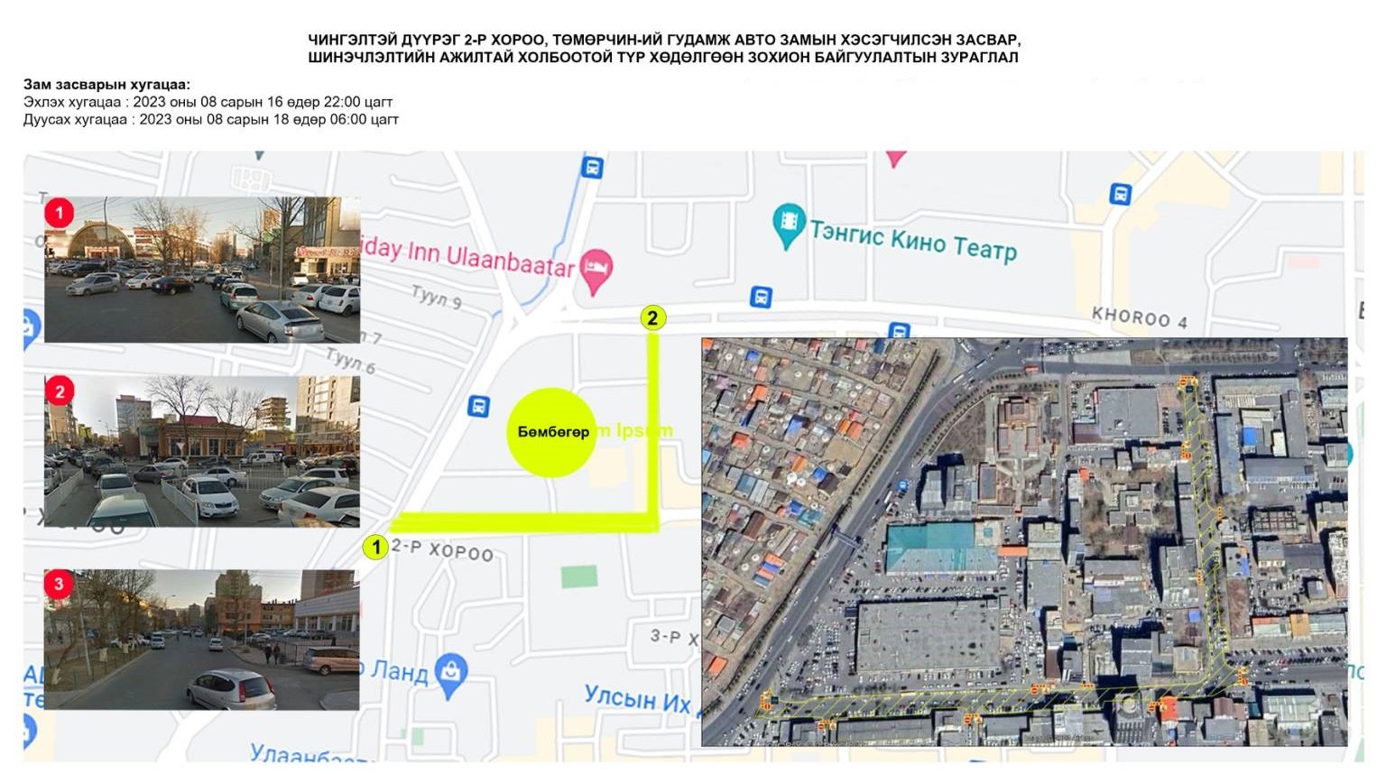 Чингэлтэй дүүргийн хоёрдугаар хороо, Төмөрчний гудамж /Бөмбөгөр худалдааны төвийн гурван замын уулзвараас Бишрэлт худалдааны төвийн уулзвар/ хүртэлх авто замыг 2023 оны 08 дугаар сарын 16-ний өдрийн 22:00 цагаас 2023 оны 08 дугаар сарын 18-ний өдрийн 06:00 цагийн хооронд хааж хэсэгчилсэн засвар, шинэчлэлтийн ажлыг хийж гүйцэтгэнэ.