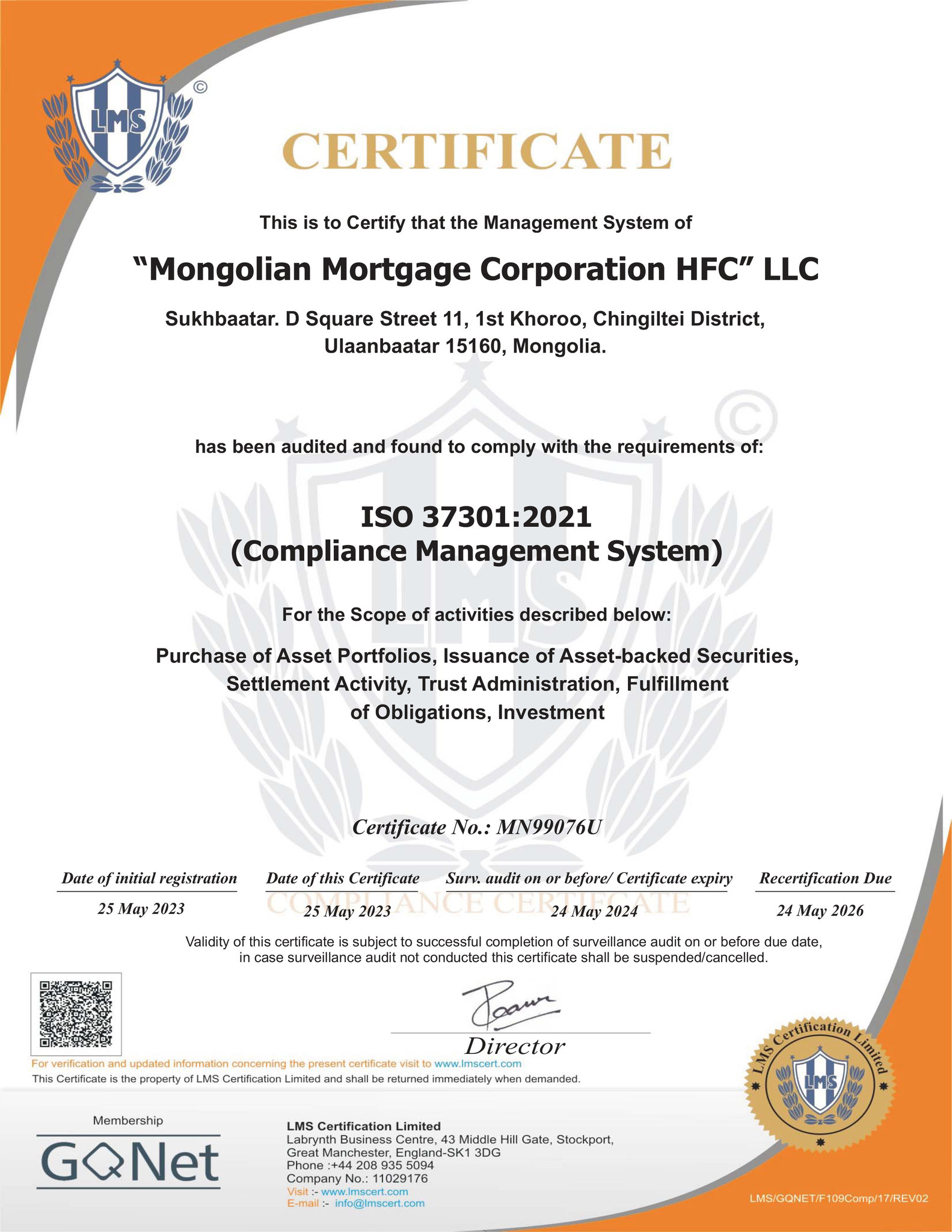 Ипотекийн хоёрдогч зах зээлийг хөгжүүлж, хөрөнгөөр баталгаажсан үнэт цаасжуулах үйл ажиллагаа явуулдаг, санхүүгийн мэргэжлийн байгууллага болох Монголын ипотекийн корпораци нь олон улсын Комплаенсийн менежментийн ISO 37301:2021 стандартыг үйл ажиллагаандаа бүрэн нэвтрүүллээ. Ингэснээр Комплаенсийн менежментийн олон улсын стандартын тогтолцоог хэрэгжүүлсэн санхүүгийн салбарын хамгийн анхны байгууллага болж байна.