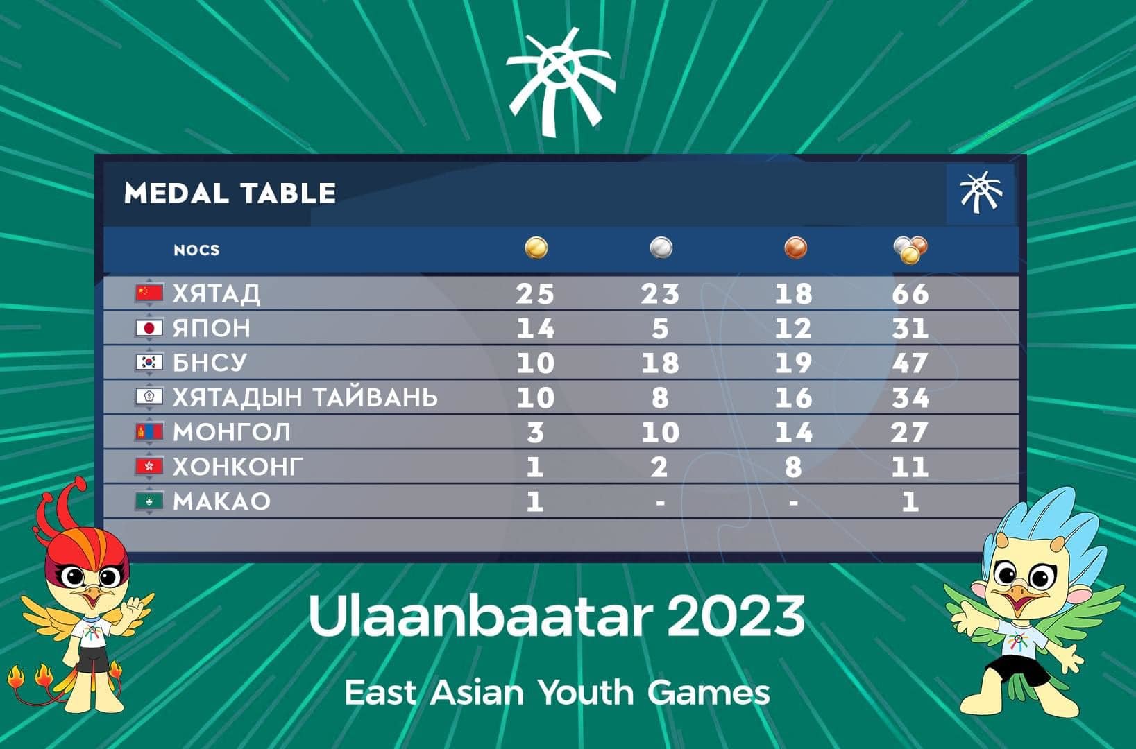 "Ulaanbaatar 2023" Зүүн Азийн залуучуудын наадам долоо дах өдрөө үргэлжилж байна. Нийт 7 Олимпын хороодын тамирчдаас медалийн тоогоор Хятадын шигшээ баг тэргүүлж байгаа бол 26 медальтайгаар Тайвань удаалж байна. Харин Монгол Улсын шигшээ баг 3 алт, 10 мөнгө, 14 хүрэл медальтайгаар хүснэгтийн тавд жагсжээ.