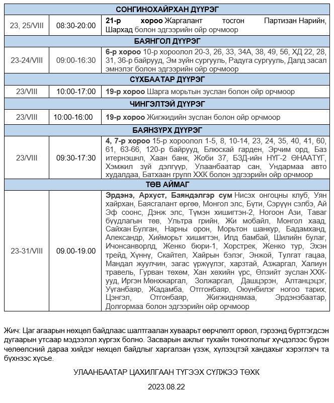 Өнөөдөр буюу 08 дугаар сарын 23-ны лхагва гаригт дараах газруудад цахилгаан хязгаарлаж, засвар үйлчилгээ хийнэ.