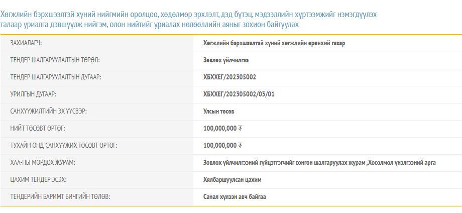 Тэгвэл өнөөдөр Хөгжлийн бэрхшээлтэй хүний хөгжлийн ерөнхий газраас нэгэн тендер зарласан байна. Тодруулбал, Хөгжлийн бэрхшээлтэй хүний нийгмийн оролцоо, хөдөлмөр эрхлэлт, дэд бүтэц, мэдээллийн хүртээмжийг нэмэгдүүлэх талаар уриалга дэвшүүлж нийгэм, олон нийтийг уриалах нөлөөллийн аяныг зохион байгуулах зорилготой уг тендерийг зарлажээ. Энэхүү үйл ажиллагаанд 100 сая төгрөг зарцуулах гэнэ.