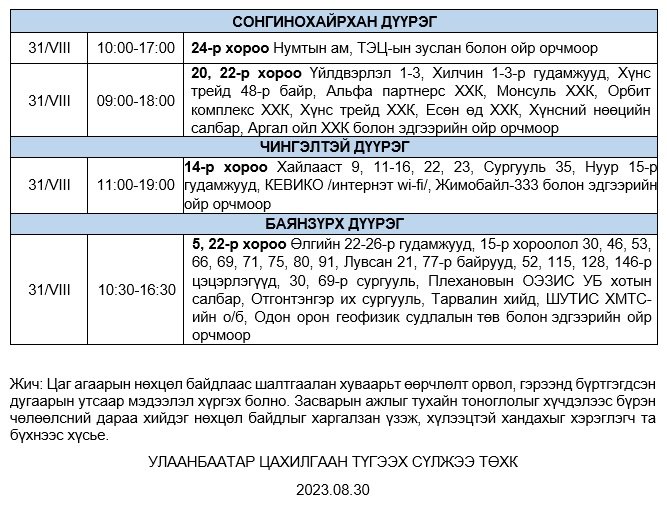 Өнөөдөр буюу 08 дугаар сарын 31-ний пүрэв гаригт дараах байршлуудад цахилгаан хязгаарлаж, засвар үйлчилгээ хийнэ.