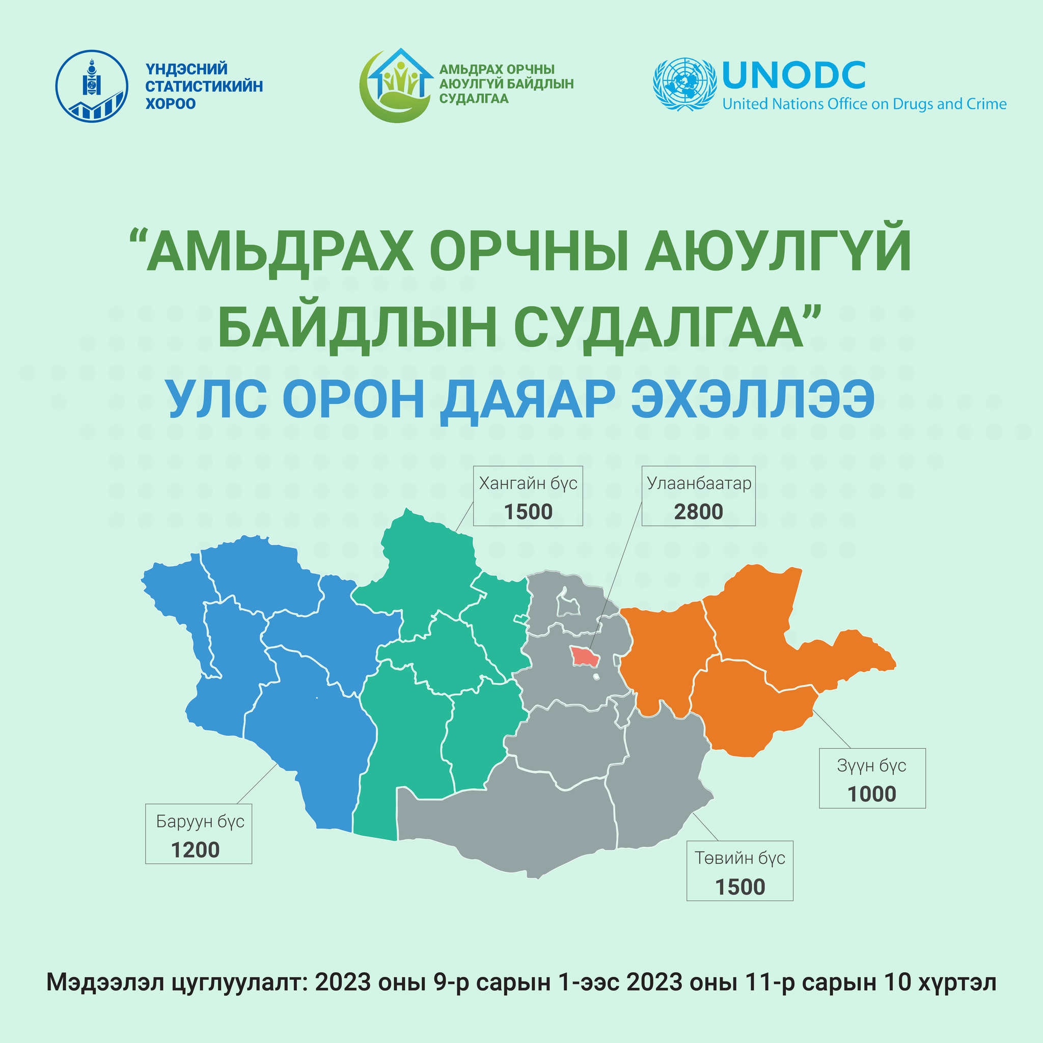 Үндэсний статистикийн хорооноос Амьдрах орчны аюулгүй байдлын судалгааг улсын хэмжээнд анх удаа авч байна. Уг судалгаа нь иргэдийн амар тайван, аюулгүй амьдрах таатай орчин хангагдсан эсэх, үүнээс шалтгаалж гэмт хэрэгт өртөх эрсдэл, хүний эрхийн зөрчил болон хууль сахиулах, шүүх эрх мэдлийн байгууллагуудын үйл ажиллагаанд иргэдийн итгэх итгэл ямар түвшинд байгааг тодорхойлох зорилготой юм. Нийт 20 баг 21 аймаг, есөн дүүргийн 8000 өрхийг санамсаргүй түүврийн аргаар сонгон судалгаа авах бөгөөд есдүгээр сарын 1-ээс арваннэгдүгээр сарын 10-ныг дуустал 70 хоногийн хугацаанд үргэлжилнэ.
