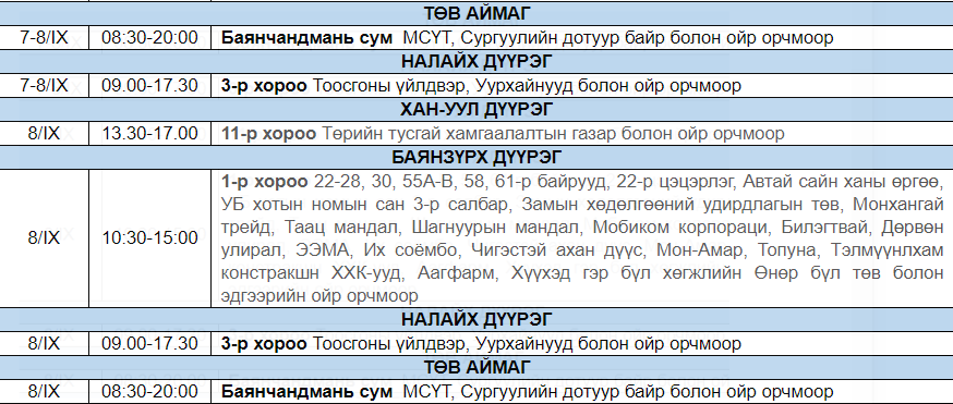 Өнөөдөр буюу 09 дүгээр сарын 08-ны баасан гаригт дараах байршлуудад цахилгаан хязгаарлаж, засвар үйлчилгээ хийнэ.