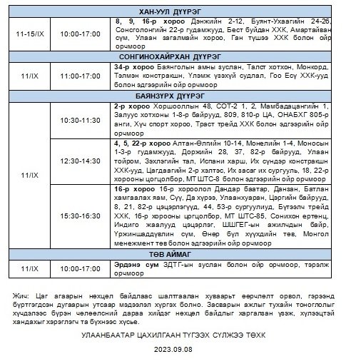 Өнөөдөр буюу 09 дүгээр сарын 11-ний даваа гаригт дараах байршлуудад цахилгаан хязгаарлаж, засвар үйлчилгээ хийнэ.