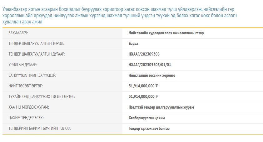 Тэгвэл өнөөдөр Нийслэлийн худалдан авах ажиллагааны газраас Улаанбаатар хотын агаарын бохирдлыг бууруулах зорилгоор хагас коксон шахмал түлш үйлдвэрлэж, нийслэлийн гэр хорооллын айл өрхүүдэд нийлүүлэх ажлын хүрээнд шахмал түлшний үндсэн түүхий эд болох хагас кокс болон асаагч худалдан авахаар ТЕНДЕР зарлажээ. Тендерийн төсөвт өртөг 31 тэрбум 914 сая төгрөг байх юм. Худалдан авалтыг нийслэлийн төсвөөс гаргана.
