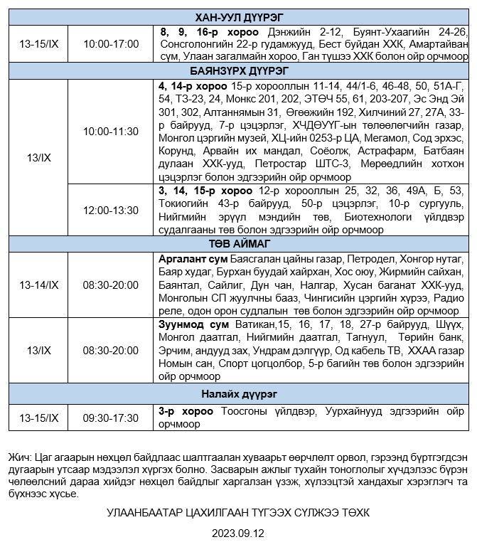 Өнөөдөр буюу 09 дүгээр сарын 13-ны лхагва гаригт дараах байршлуудад цахилгаан хязгаарлана.