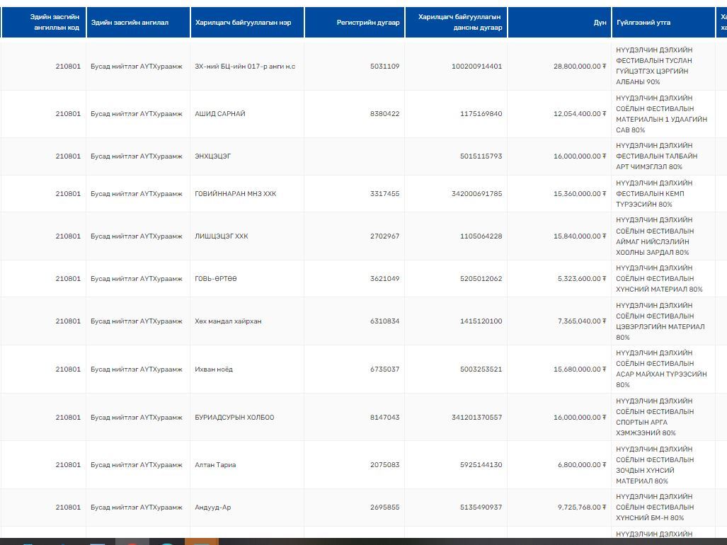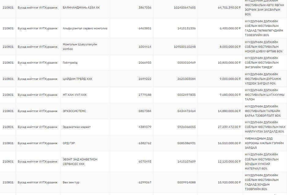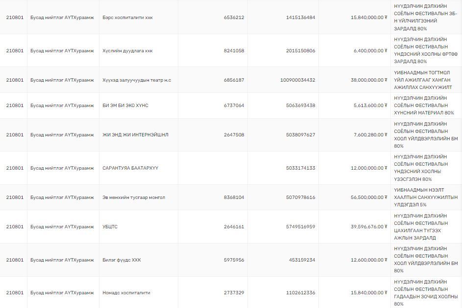 Харин Засгийн газрын хэрэгжүүлэгч агентлаг болох Н.Мөнхзул даргатай Соёл урлагийн газар Шилэн дансандаа 1.1 тэрбум төгрөгийн зарцуулалтыг тайлагнажээ. Шилэн дансны мэдээллээс харахад долдугаар сараас эхлэн Нүүдэлчин фестивальд зориулан Соёл урлагийн газраас эхний гүйлгээг хийсэн байна. Тодруулбал, долдугаар сард Соёл урлагийн газраас 54 сая төгрөгийг ХҮННҮ ЭЙР ХХК руу тийзний зардал утгатайгаар шилжүүлсэн байна. Гэхдээ ямар хүмүүсийг онгоцоор авчирч Нүүдэлчин фестивальд оролцуулсан эсэх нь тодорхойгүй байна. Энэ талаар хавсралтаар мэдээлэл оруулаагүй байна.