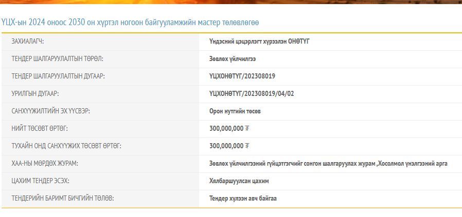 Тодруулбал, Үндэсний цэцэрлэгт хүрээлэн 2024 оноос 2030 он хүртэл ногоон байгууламжийн мастер төлөвлөгөө гаргуулахаар тендер зарлажээ. Тендерийн төсөвт өртөг 300 сая төгрөг байх юм. Тус хүрээлэн энэ онд нийт 18 төрлийн бараа ажил үйлчилгээ худалдан авах төлөвлөгөөтэй ажиллаж байгаа бөгөөд тендерийн баримт бичигт тусгагдсан ЗУРГААН жилийн төлөвлөгөө гаргуулах тухай дурьдагдаагүй байна.