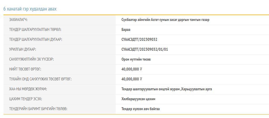 Санхүүжилтийн эх үүсвэр орон нутгийн төсөв байхаар тендерийн баримт бичигт дурьдсан байна. Тус сумын хувьд 2023 онд 43 төрлийн бараа үйлчилгээ худалдан авахаар Засаг даргын тамгын газрынхаа Шилэн дансанд мэдээлжээ. Гэхдээ дээрх ЗУРГААН ханатай гэрийг худалдан авах тухай мэдээлэл Шилэн дансны мэдээлэлд дурьдагдаагүй байна.